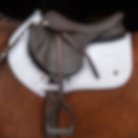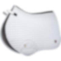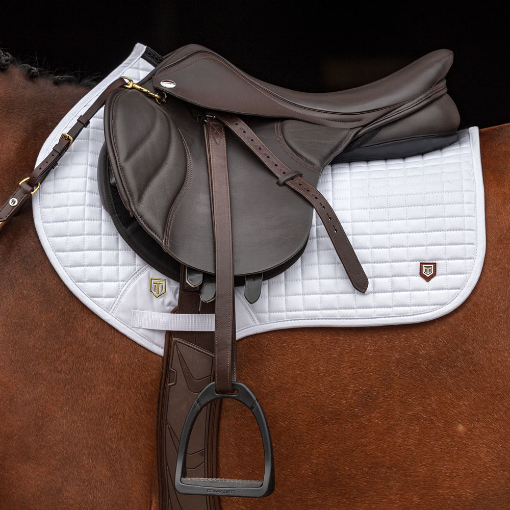 Gewatteerde katoenen zadeldeken gevoerd met verkoelend, vochtafvoerend technisch materiaal. 3D-mesh paneel langs de rug voor extra ventilatie. Dankzij de korte elastische band die aan de D-ring van het zadel wordt bevestigd, kan de deken worden aangepast aan de meeste modellen. Extra versteviging bij zadelsingel vermindert het risico op slijtage. Geborduurd Trinity-embleem op de versterking van de zadelsingel, Trinity metalen logo op de linkerkant.
