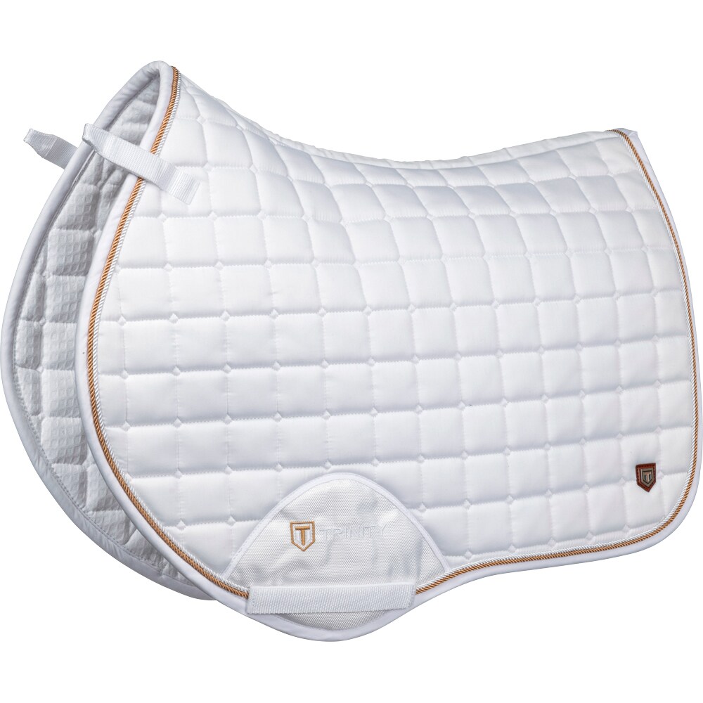 Gewatteerde katoenen zadeldeken met wafelgeweven katoenen voering, stevige vulling van 400 g polyesterwatten en 8 mm schuim. Extra versteviging bij zadelsingel. Boorden en twee zijden vlechten. Geborduurd Trinity-embleem op de versterking van de zadelsingel, Trinity metalen logo op de linkerkant.