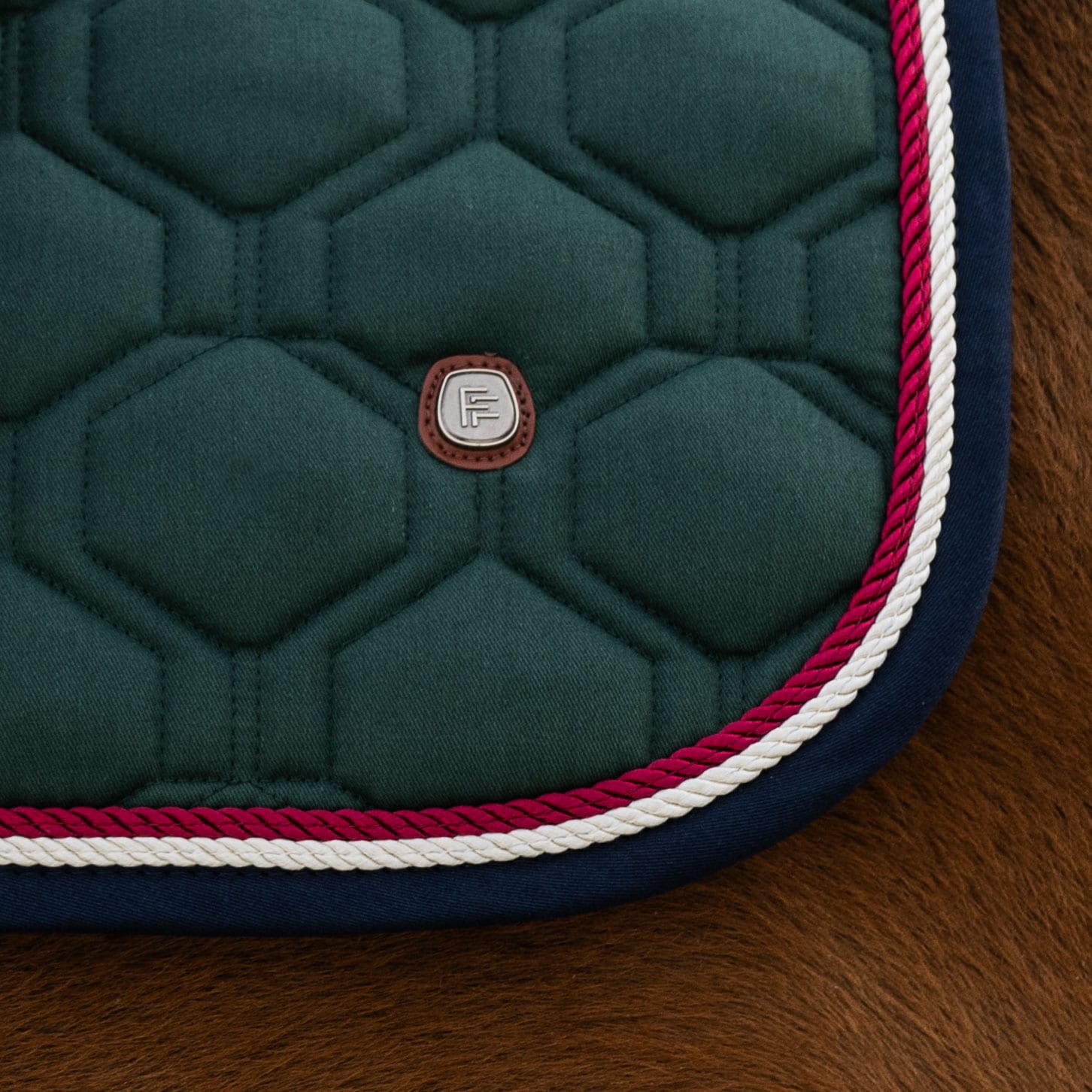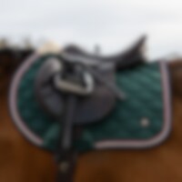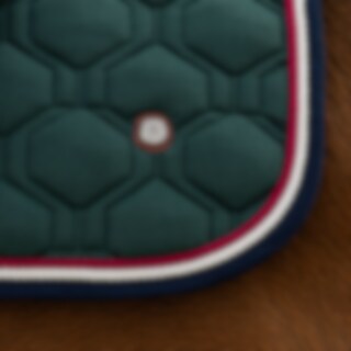 Zadeldek met quiltpatroon van slijtvast polyester/katoenen keperstof aan de buitenzijde. Sterke combinatievulling van 300 g polyfill + 1 cm schuim zorgt voor een stevig sjabrak dat de vorm behoudt en goed blijft liggen. Binnenzijde van 100% polyester, functioneel materiaal dat bijdraagt aan het afvoeren van vocht van het paard. Teddyvoering bij de nek om schuren te voorkomen en een paneel van 3D-mesh langs de ruggengraat voor extra ventilatie. Versteviging bij de zadelriem voor extra slijtvastheid en korte banden voor bevestiging aan de D-ring van het zadel zorgen ervoor dat het sjabrak bij de meeste zadels past. Versierd met twee zijden biezen en metalen logo.