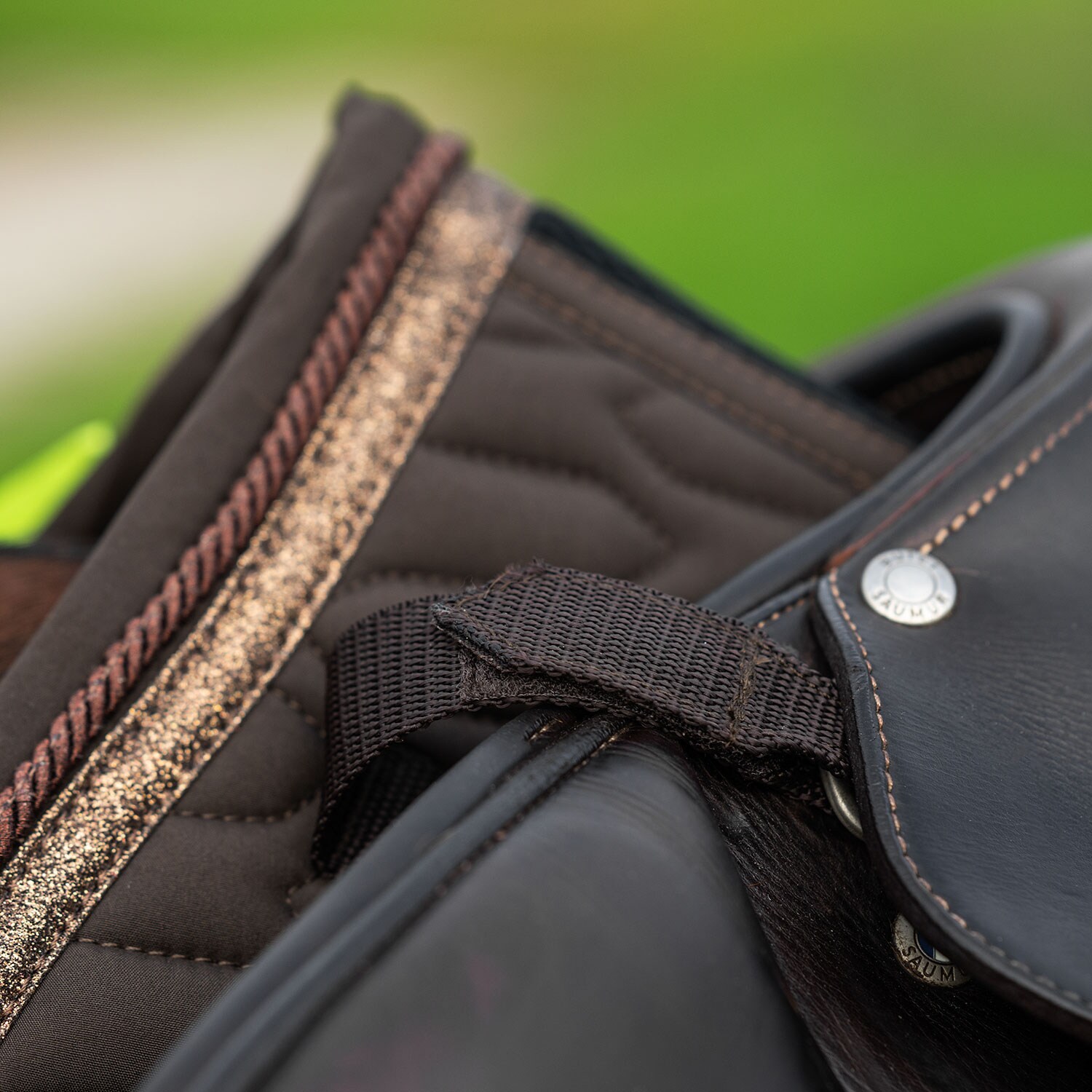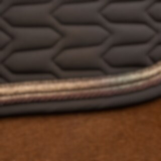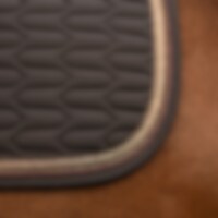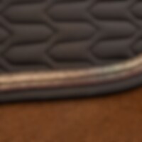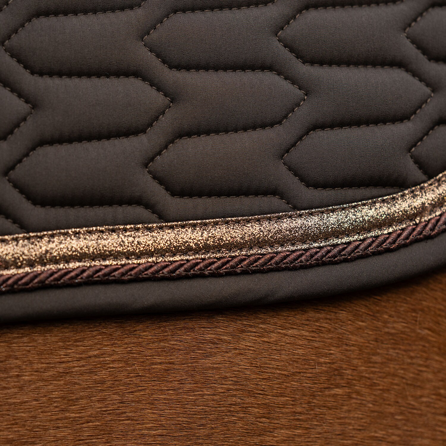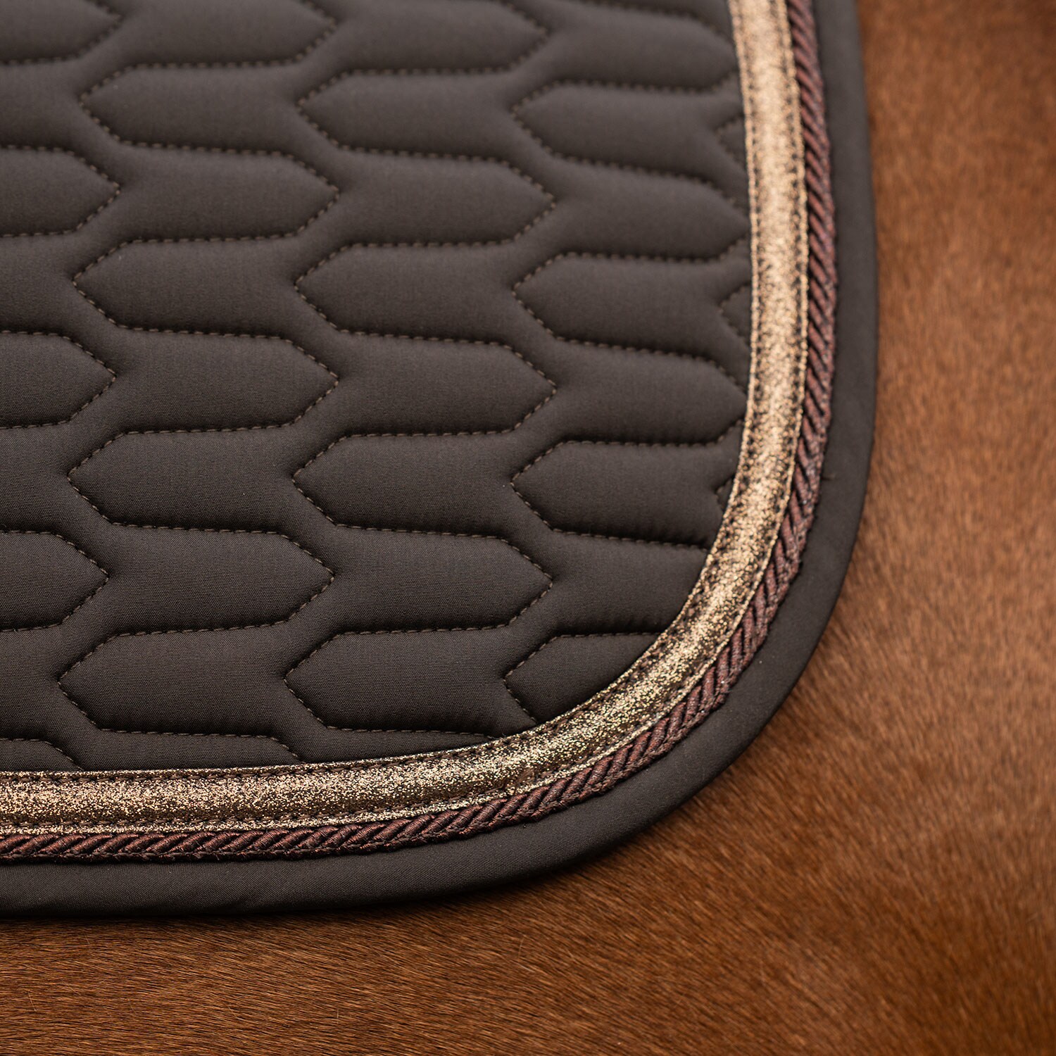 Zadeldek van polyester keperstof met een klein gewatteerd zigzagpatroon. Stevig combinatiekussen in 300g polyfill + 1,2cm schuim dat zorgt voor een stevig zadeldek dat op zijn plaats blijft en was na was zijn vorm behoudt. Het polyester coolmax interieur helpt vocht af te voeren om een comfortabele temperatuur voor het paard te behouden. - Mesh paneel langs de ruggengraat voor meer ventilatie. Versterkt bij de singel voor extra duurzaamheid, korte klittenbandsluitingen voor bevestiging aan de d-ring van het zadel zorgen ervoor dat het onder de meeste zadelmodellen past. Versierd met glitterlint en zijden bies in lurex, Wit zadeldek met witte binnenkant, andere met zwarte binnenkant.