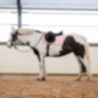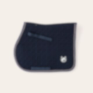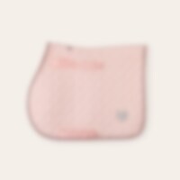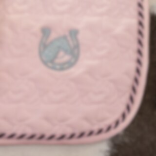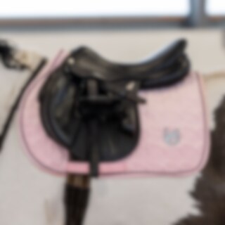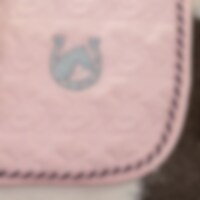 Gewatteerde zadeldeken met eenhoornmotief van stevig polycotton twill, afgewerkt met glitter en tweekleurige zijden biezen. Borduurwerk met glitters in de hoek. Lange banden met klittenband ter bevestiging aan de zadelriemen. Combinatievulling van 180 g p