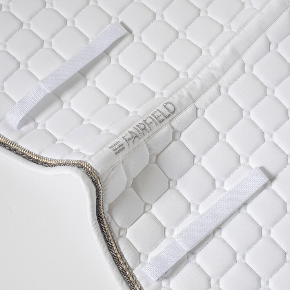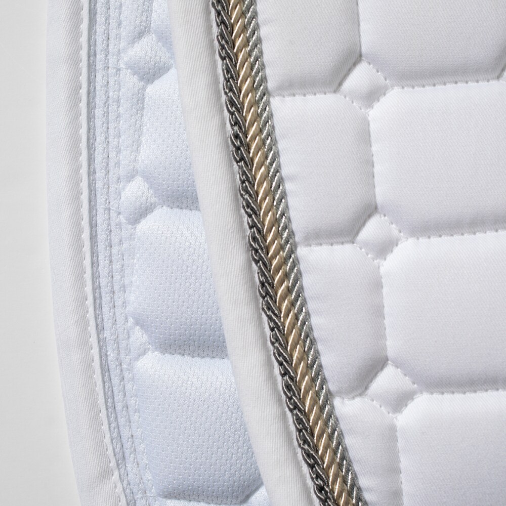Sjabrak met sterke combinatievulling van 120 g polyfill en 1,2 cm schuim dat een licht schokdempend effect geeft en ervoor zorgt dat het sjabrak ook na vele wasbeurten zijn vorm behoudt. Buitenstof van duurzame 100% katoenen keperstof, versierd met drie polyesterzijden biezen. De binnenkant van zacht, flexibel coolmax dat vocht van het paard afvoert om zweet en schuren te voorkomen. Perfect voor borduren.