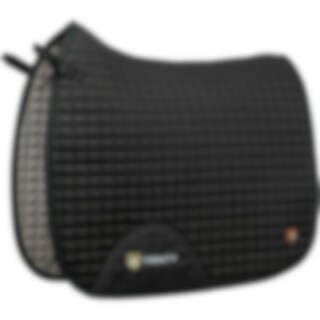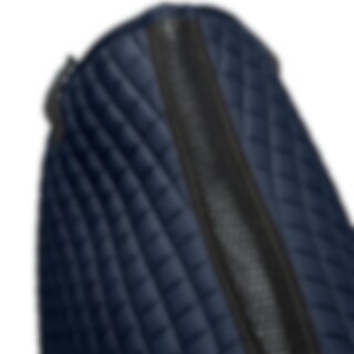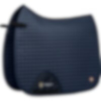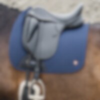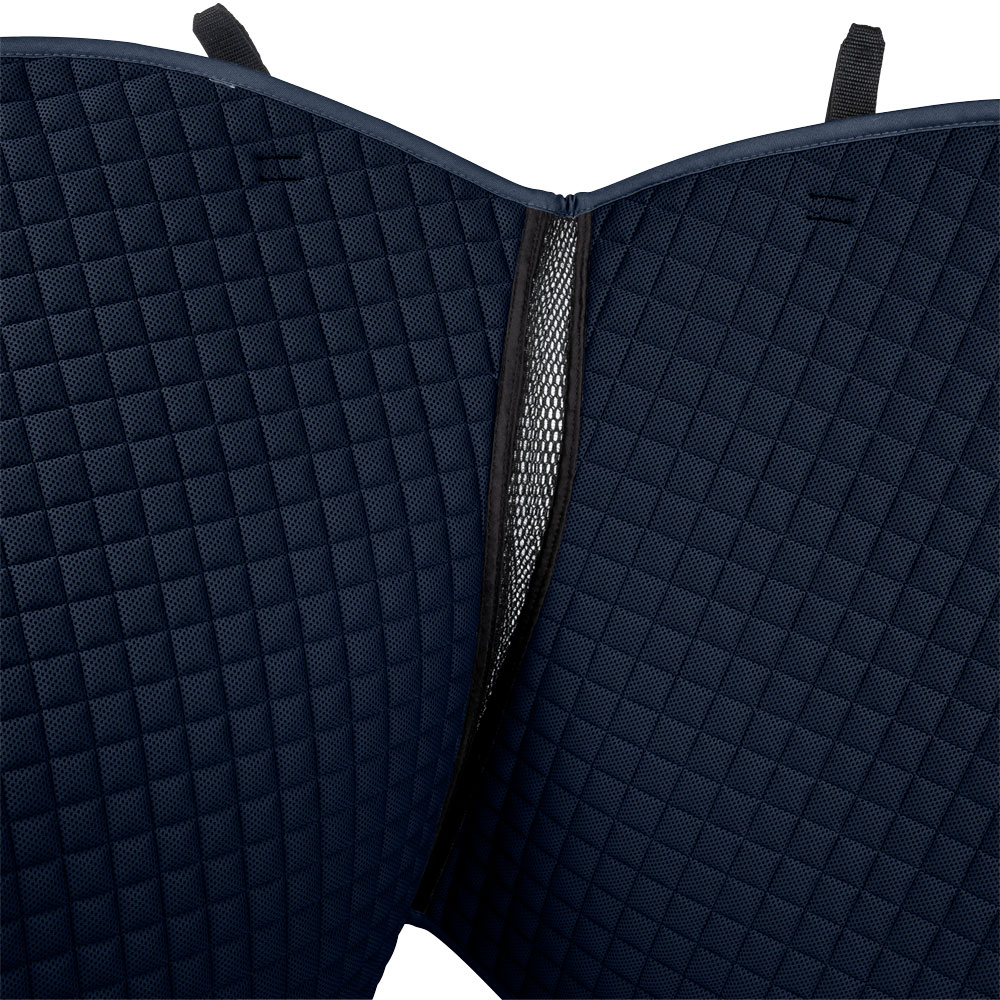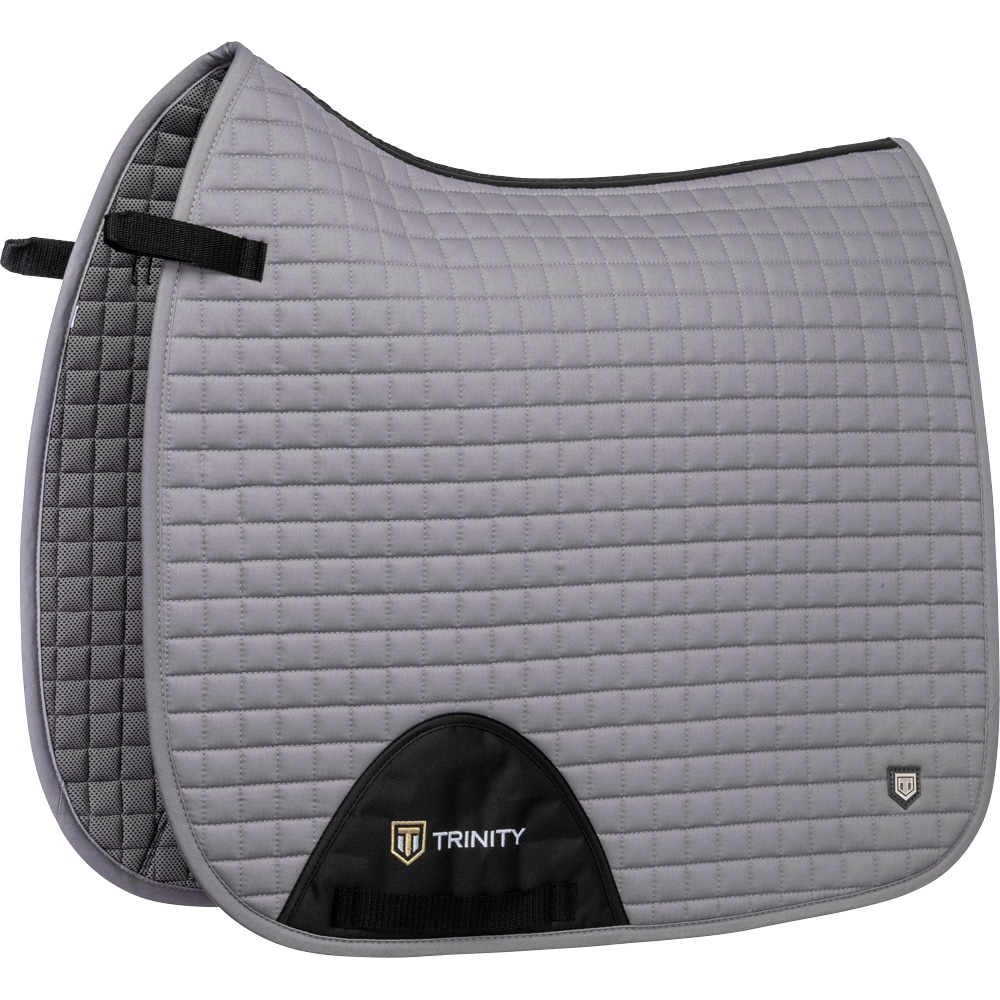 Gewatteerde katoenen zadeldeken gevoerd met verkoelend, vochtafvoerend technisch materiaal. 3D-mesh paneel langs de rug voor extra ventilatie. Dankzij de korte elastische band die aan de D-ring van het zadel wordt bevestigd, kan de deken worden aangepast aan de meeste modellen. Extra versteviging bij zadelsingel vermindert het risico op slijtage. Geborduurd Trinity-embleem op de versterking van de zadelsingel, Trinity metalen logo op de linkerkant.