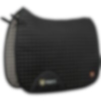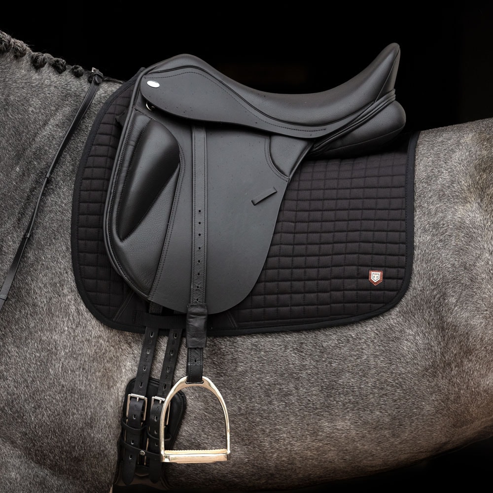 Gewatteerde katoenen zadeldeken gevoerd met verkoelend, vochtafvoerend technisch materiaal. 3D-mesh paneel langs de rug voor extra ventilatie. Dankzij de korte elastische band die aan de D-ring van het zadel wordt bevestigd, kan de deken worden aangepast aan de meeste modellen. Extra versteviging bij zadelsingel vermindert het risico op slijtage. Geborduurd Trinity-embleem op de versterking van de zadelsingel, Trinity metalen logo op de linkerkant.