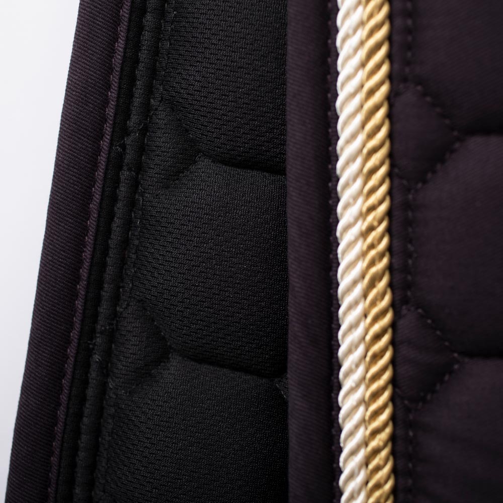 Sjabrak met quiltpatroon met slijtvaste katoenen keperstof aan de buitenzijde. Sterke combinatievulling van 300 g polyfill + 1 cm schuim zorgt voor een stevige sjabrak die de vorm behoudt en goed blijft liggen. Binnenzijde van 100% polyester, functioneel materiaal dat bijdraagt aan het afvoeren van vocht van het paard. Teddyvoering bij de nek om schuren te voorkomen en een paneel van 3D-mesh over de ruggengraat voor ventilatie. Extra verstevigd bij de zadelriem voor extra slijtvastheid. Korte banden voor bevestiging aan de d-ring van het zadel zorgen ervoor dat het sjabrak op de meeste zadels past.
