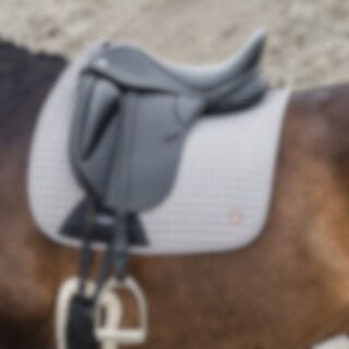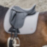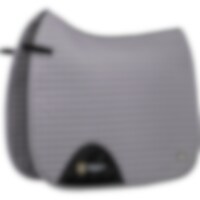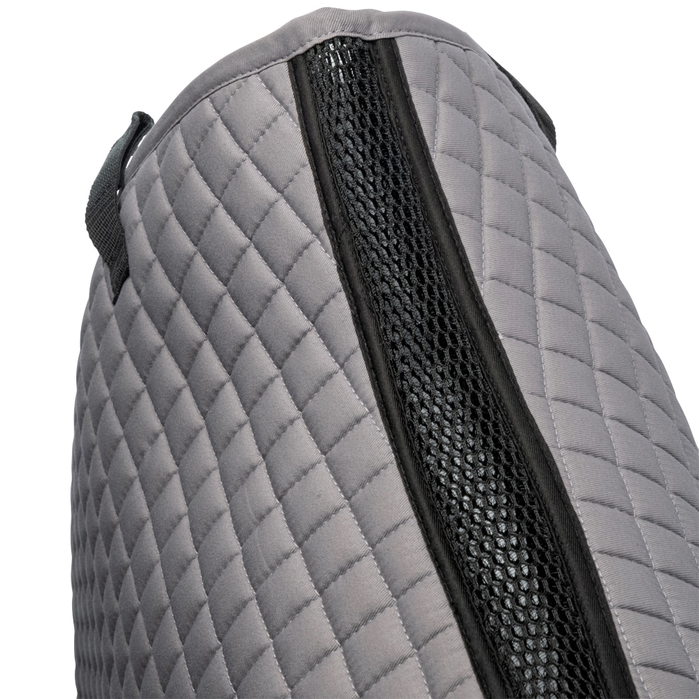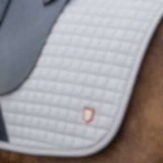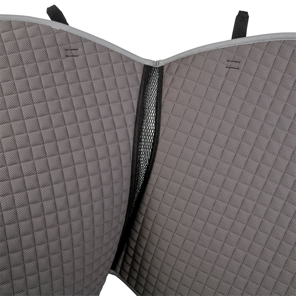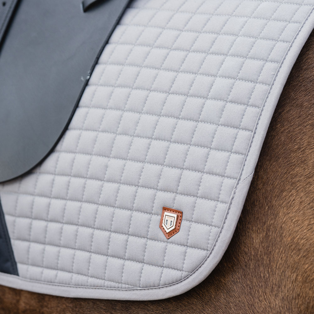 Gewatteerde katoenen zadeldeken gevoerd met verkoelend, vochtafvoerend technisch materiaal. 3D-mesh paneel langs de rug voor extra ventilatie. Dankzij de korte elastische band die aan de D-ring van het zadel wordt bevestigd, kan de deken worden aangepast aan de meeste modellen. Extra versteviging bij zadelsingel vermindert het risico op slijtage. Geborduurd Trinity-embleem op de versterking van de zadelsingel, Trinity metalen logo op de linkerkant.