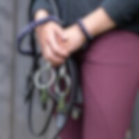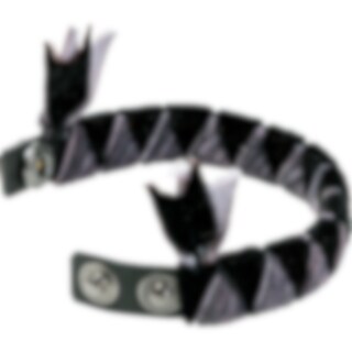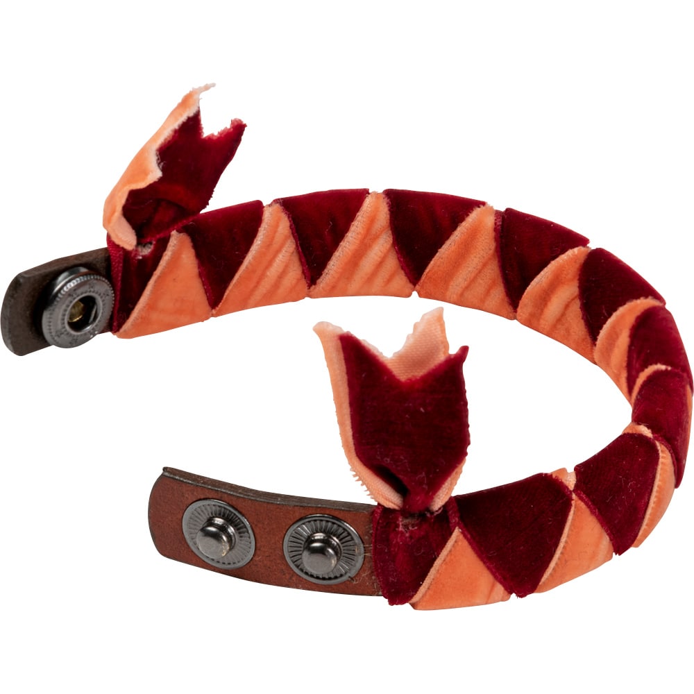Armband i läder dekorerat med flätade sammetsband. Två tryckknappar för möjlighet av måttinställning. Mått: Knapp 1: 18,5 cm. Knapp 2: 20 cm.
