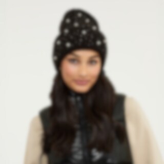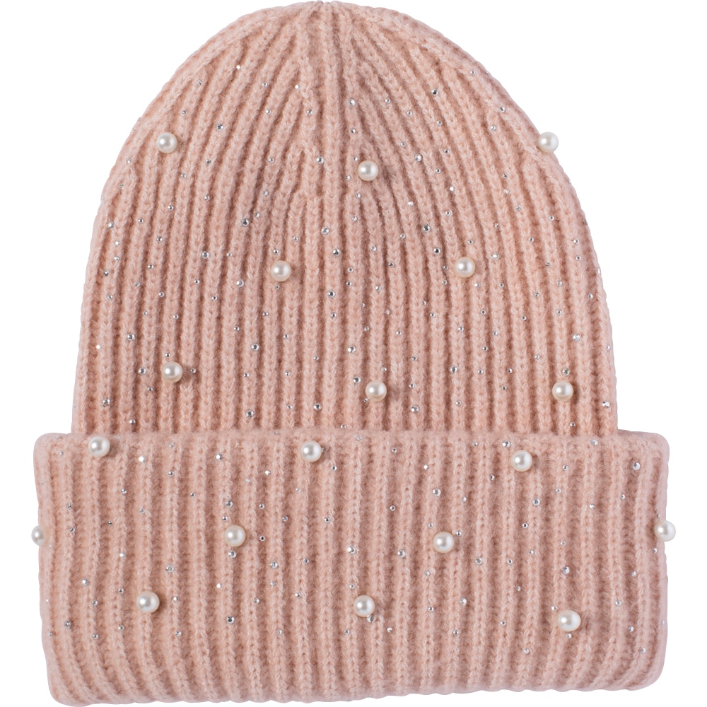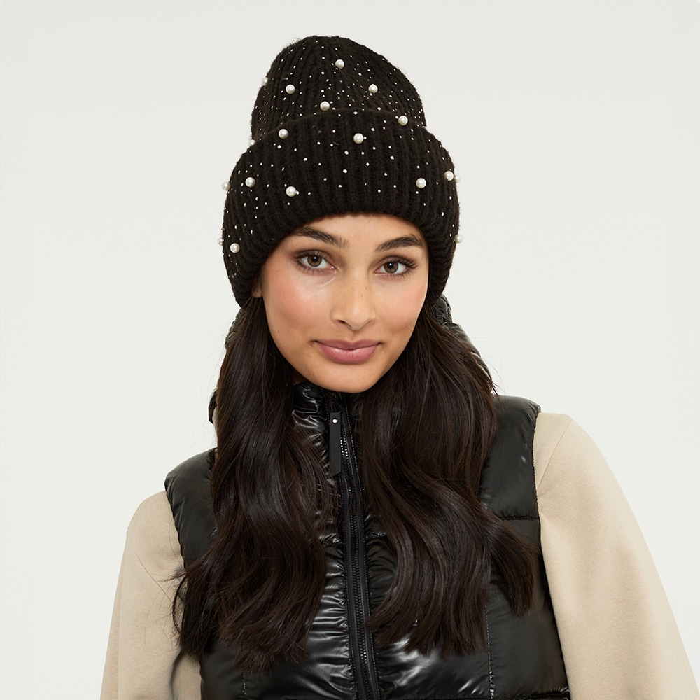 Ribgebreide muts van Fairfield. Versierd met strass-steentjes en parels die een stijlvolle en moderne uitstraling geven. Eén maat.