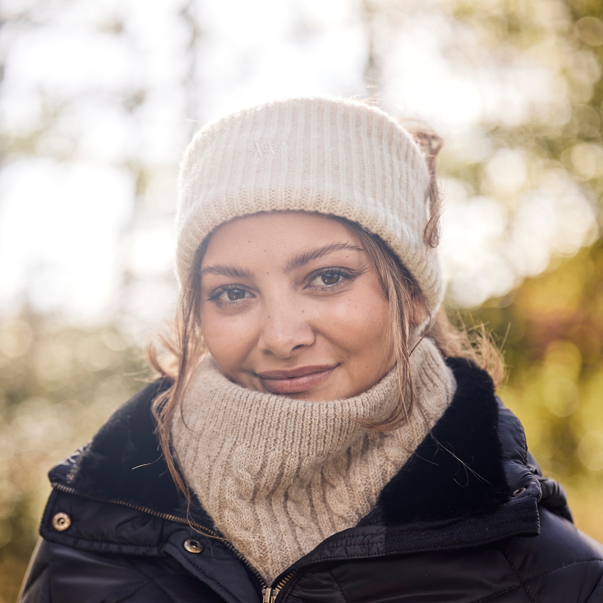 Kabelgebreide buissjaal die je warm houdt tijdens de koudere dagen.