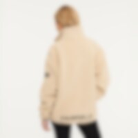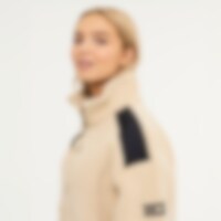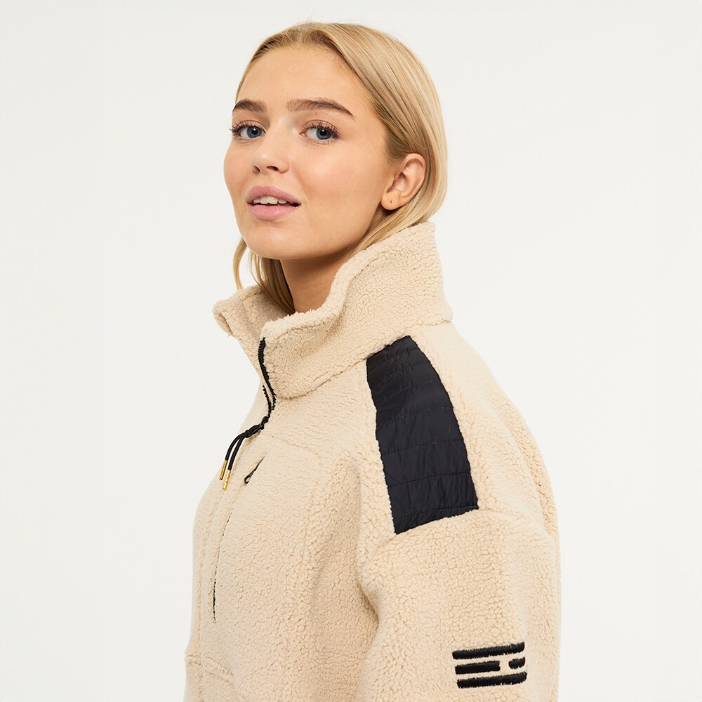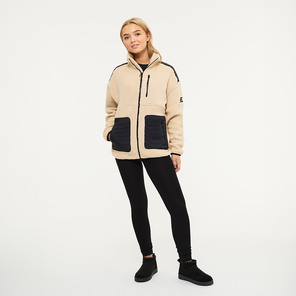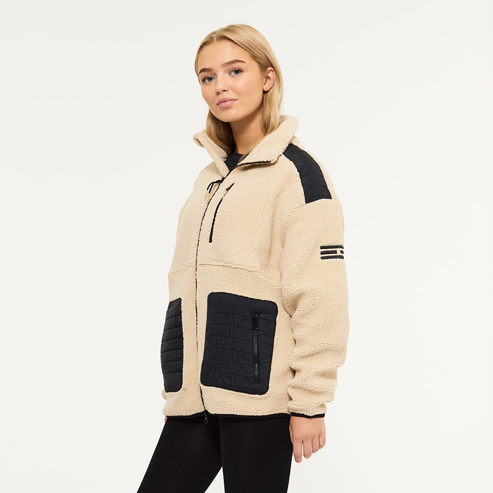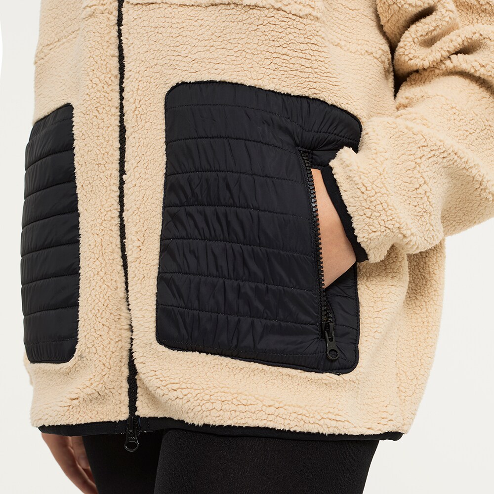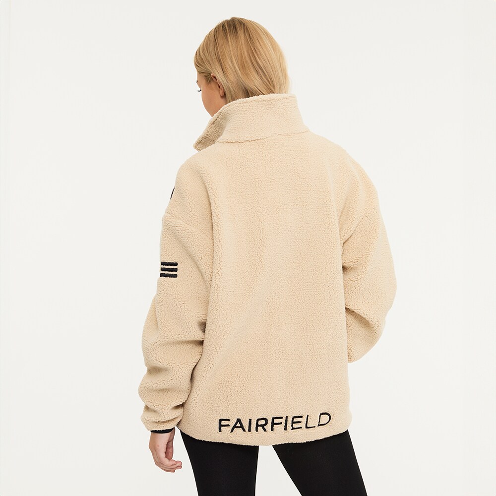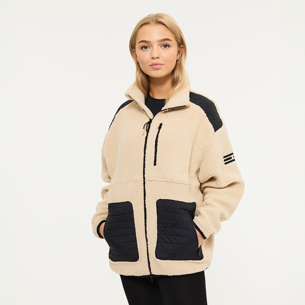 Teddyjack met hoge kraag. Met gewatteerde details op de schouders en voorzakken heeft de jas een moderne en trendy uitstraling. Praktische kenmerken zijn onder meer twee voorzakken en een borstzak, allemaal met ritssluiting. Het Farfield-logo siert de achterkant, terwijl een kleiner logo op de linkermouw een subtiel maar stijlvol detail toevoegt. Elastische boord langs de mouwen en de onderzijde. Met een relaxte pasvorm is dit jack ideaal voor zowel dagelijks gebruik als trainingen.