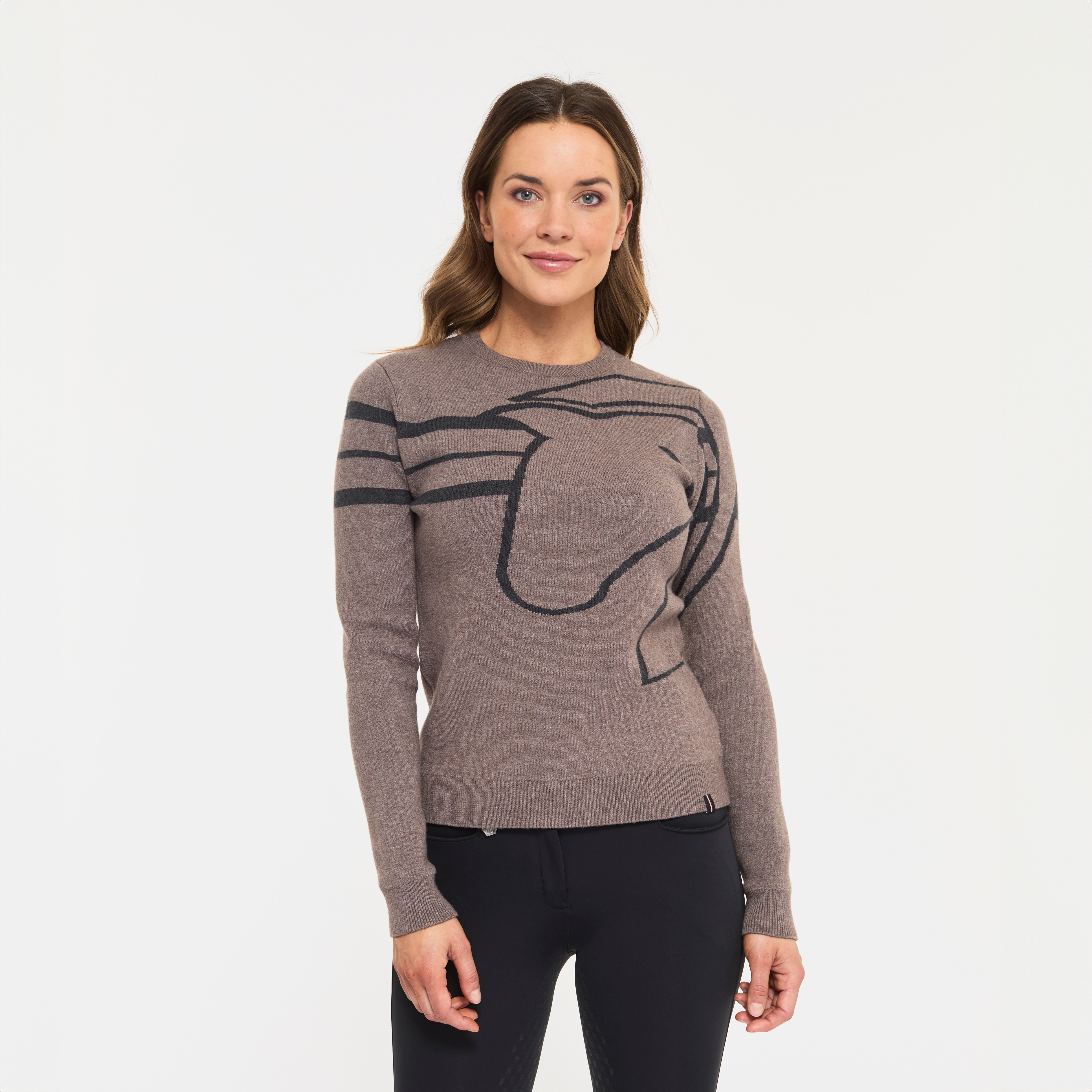 Gebreide trui van zachte en fraaie kwaliteit. Ronde hals en ribstof aan de onderzoom en de mouwen.