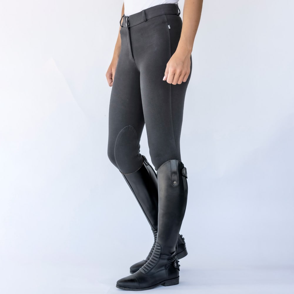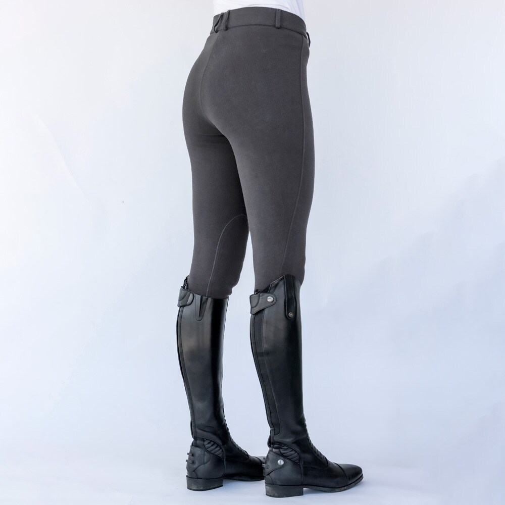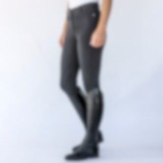 Comfortabele basisrijbroek van katoenen stretchtricot met knieversteviging. Normaal taillehoogte. Elastiek onderaan de pijpen. Voering met intasten.