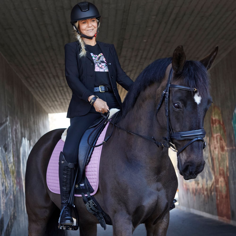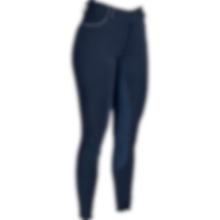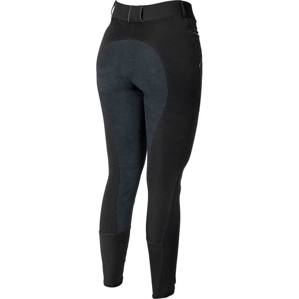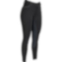 Rijbroek met zadelgedeelte van gerecycled polyester geheel versterkt met Daewoo. Twee open zakken aan de voorzijde en zakje voor mobiele telefoon met ritssluiting op rechterdij. Intasten in voering en tricot onderaan de pijpen. Sierrand in contrasterende
