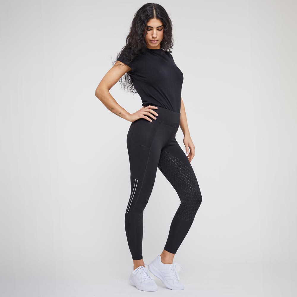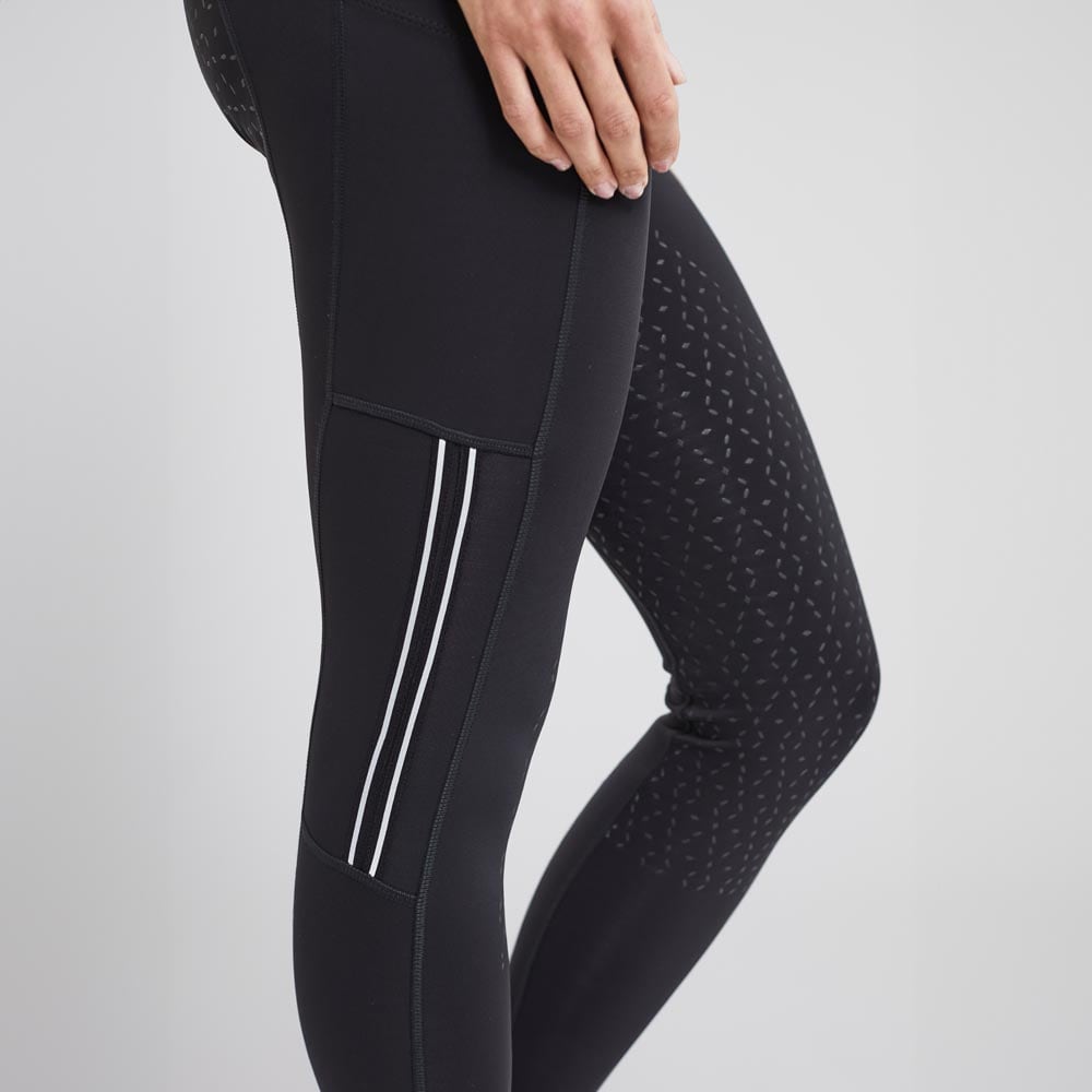 Rijlegging met zadelinzet van vormvast compressiemateriaal. Normale taillehoogte met een brede band die zowel goed comfort als stabiliteit biedt. Met volledige griplaag voor een zachte zit in het zadel. Open zakken voor mobiele telefoon op de bovenbenen, met griplaag aan de binnenzijde zodat de telefoon er niet uit valt. Reflecterende details aan de buitenzijde van de pijpen.