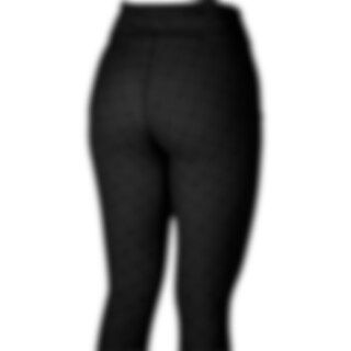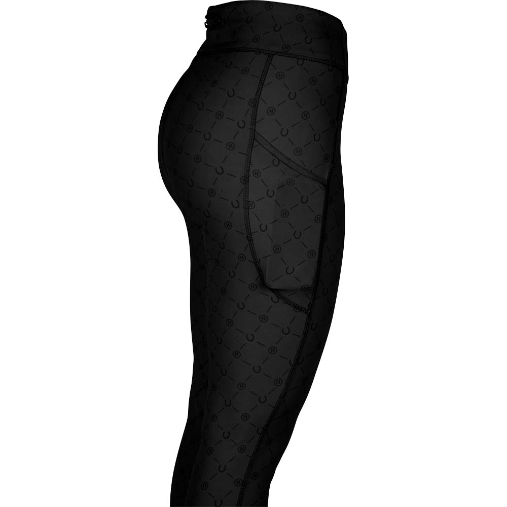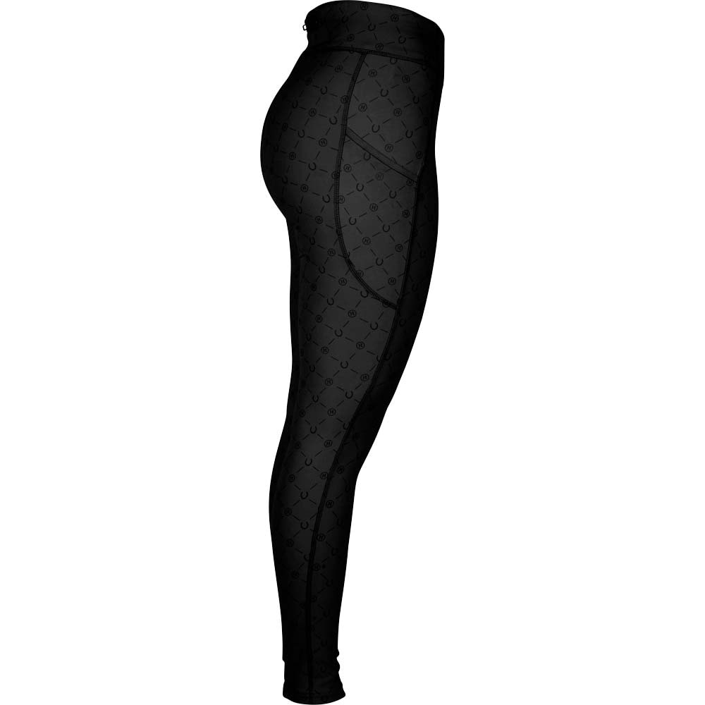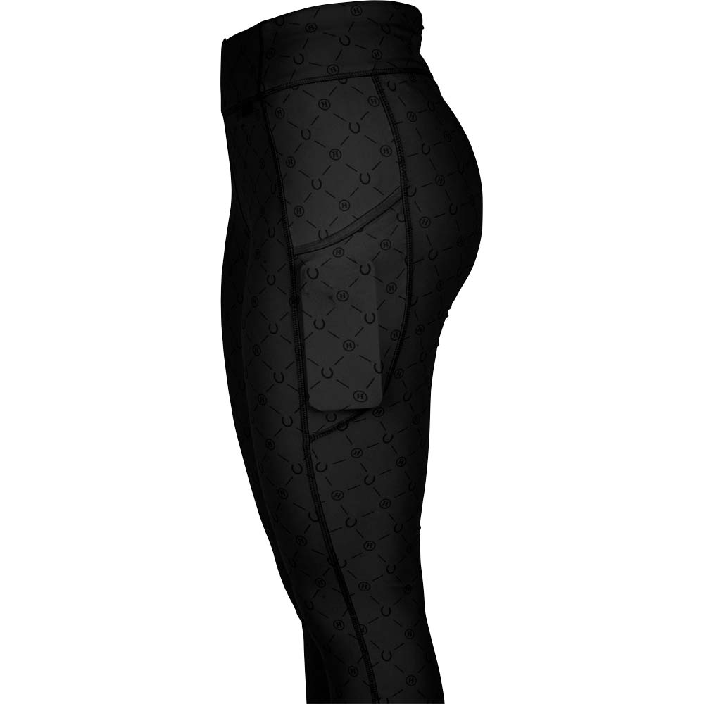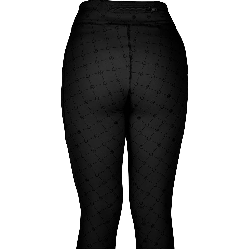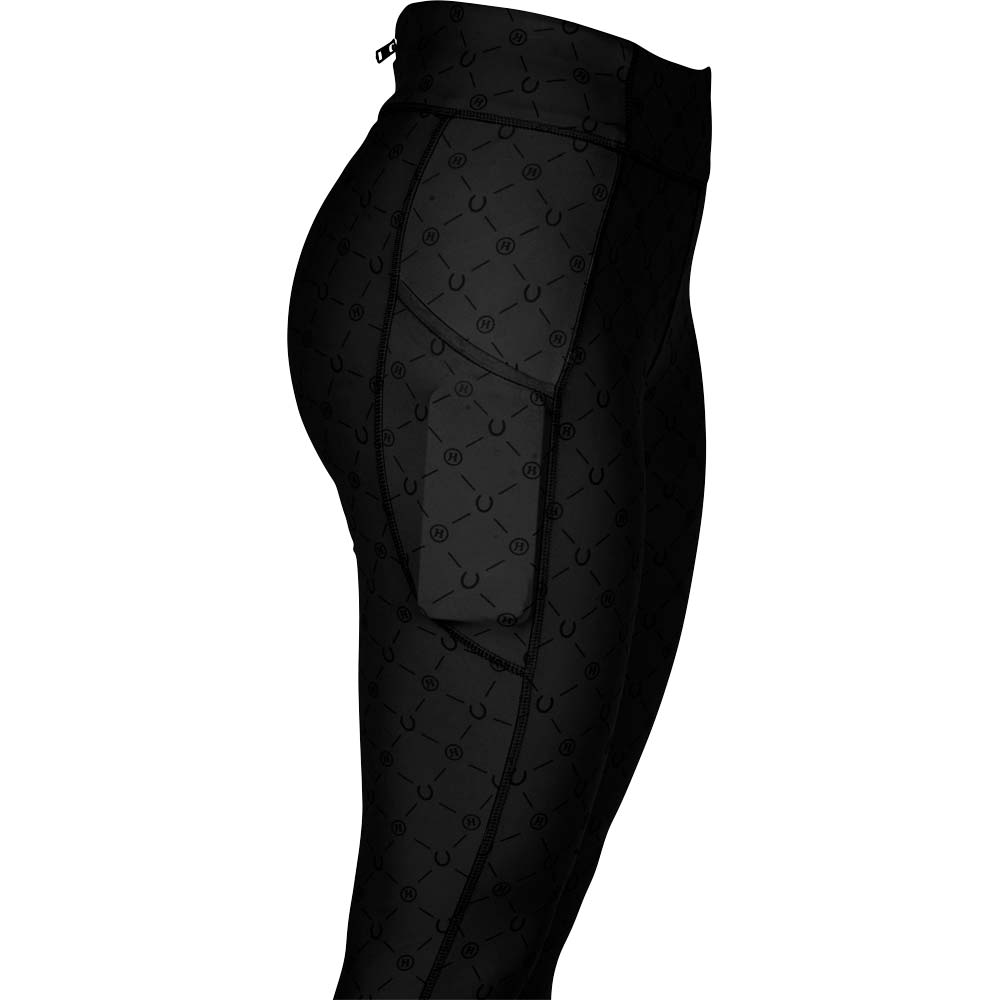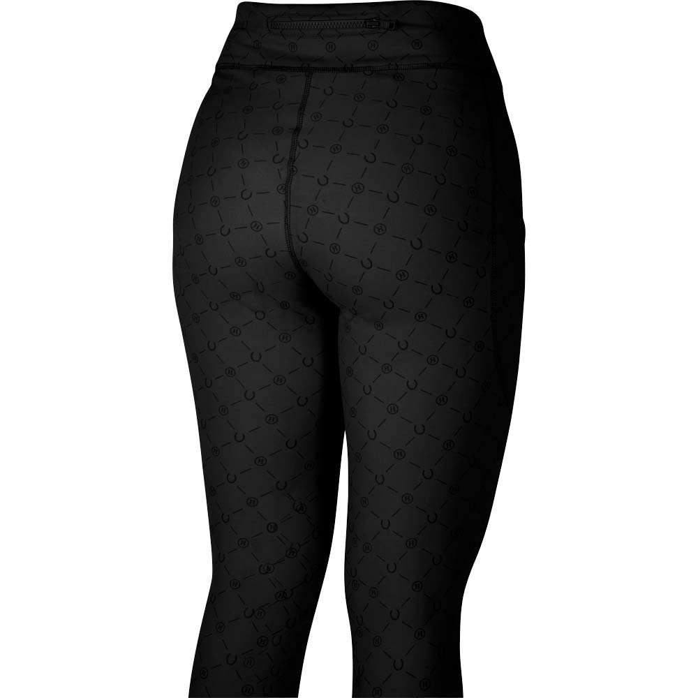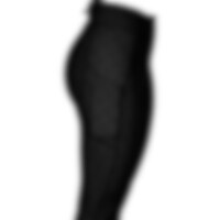 Rijlegging van compressiemateriaal met kniebescherming in bedrukt patroon. Zakken voor mobiele telefoon op de zijkant van de bovenbenen, met griplaag aan de binnenzijde zodat de telefoon er niet uit valt. Achterzak met ritssluiting achter de voering.