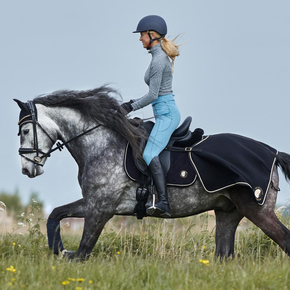 Rijbroek met kniebescherming van compressiemateriaal. Geborstelde binnenzijde. Zakken voor mobiele telefoon op de zijkant van de bovenbenen, met griplaag aan de binnenzijde zodat de telefoon er niet uit valt. Achterzak met ritssluiting achter de voering.