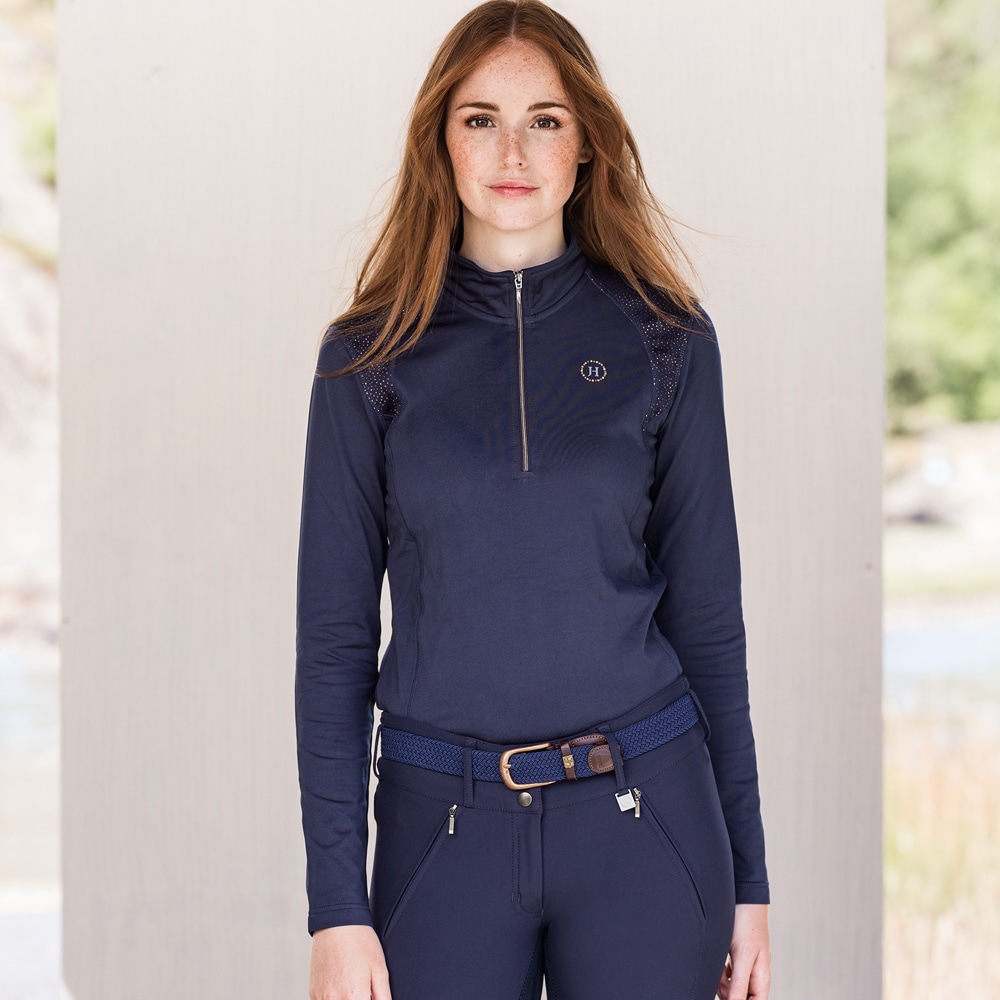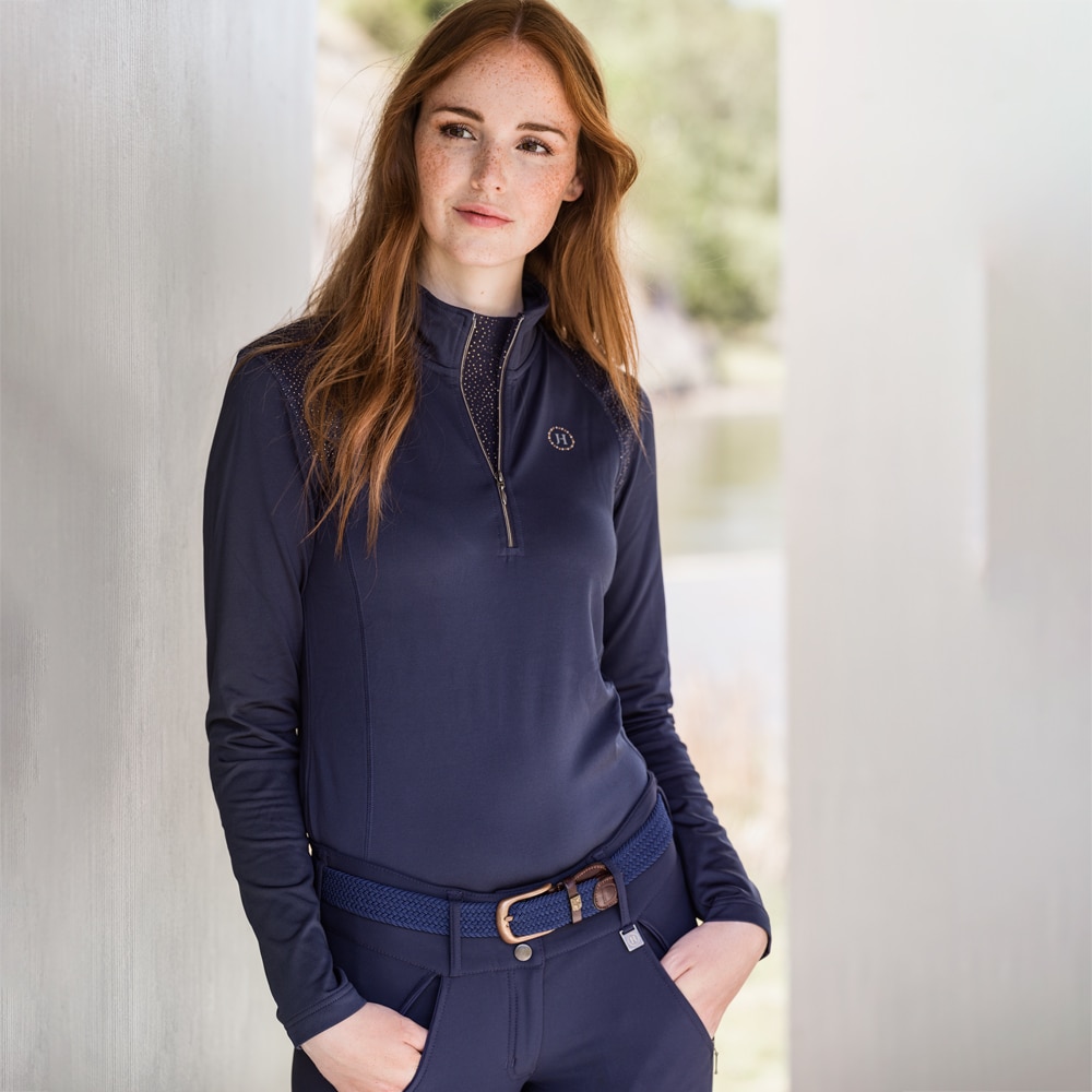 Trui van zacht technisch materiaal met geborstelde binnenkant. Opstaande kraag met ritssluiting en mesh paneel in de nek. Getailleerde snit.