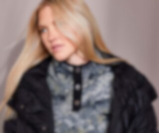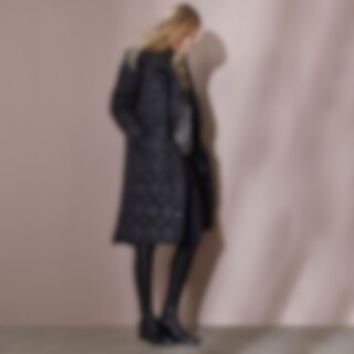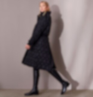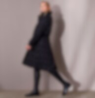 Jas in quiltpatroon met hoge kraag en trekkoord in de taille. Sluiting met tweewegrits en drukknoppen voor. Rijopening met rits aan de achterzijde. Twee zakken met drukknopen aan de voorzijde en een zakje met ritssluiting aan de binnenzijde. Manchetten aan de mouwen. Behandeld met Rudolf Bionic Finish Eco.