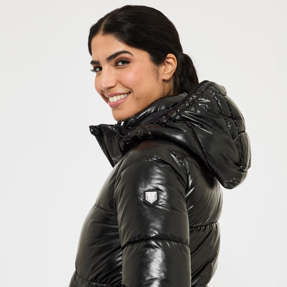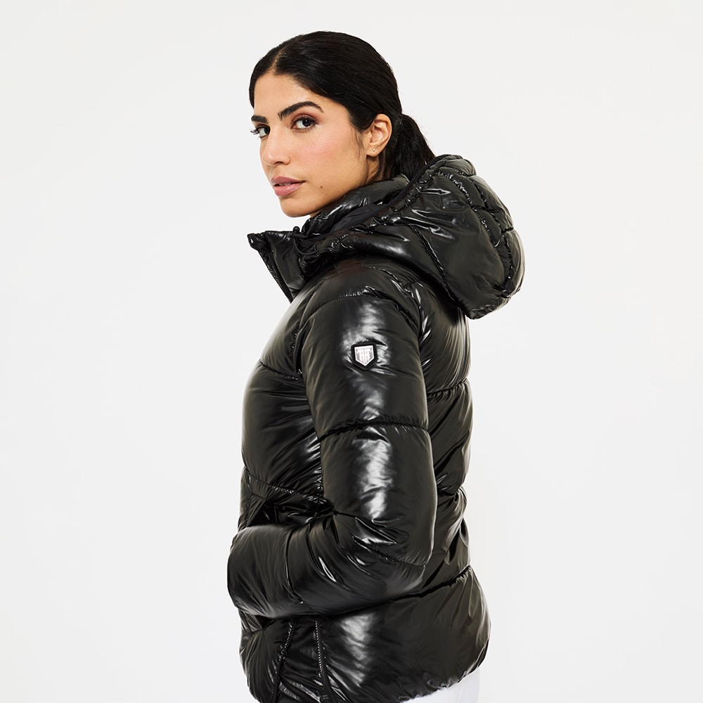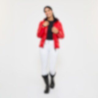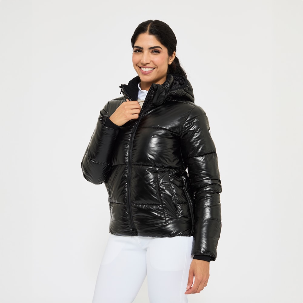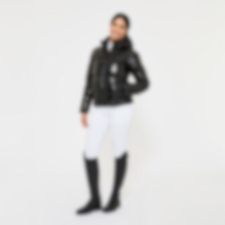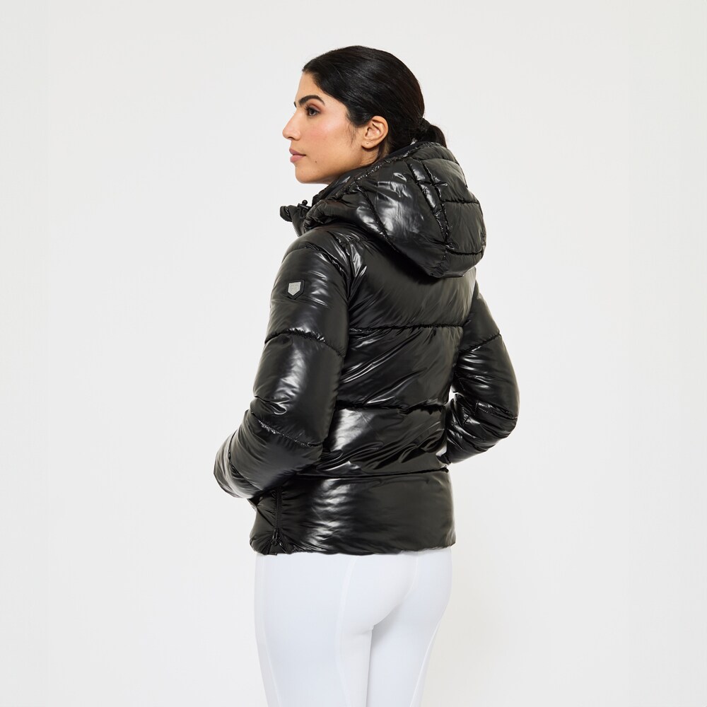 Sportief, warm gevoerd pufferjack met glanseffect in de stof. Gewatteerd met polyestervoering dat op dons lijkt en ook zo aanvoelt. De jas heeft een ruime pasvorm met elastiek in de taille. Praktische tweewegritssluiting met kinbescherming voorop en rijopeningen in de zijden maken dit tot een functionele en comfortabele paardrijjas. Afneembare en verstelbare capuchon, hoge kraag met fleecevoering en mouwen met ribmanchetten. De jas is voorzien van twee ruime met fleece gevoerde zakken en een binnenzak met ritssluiting. Ontworpen voor kouder en droger weer.