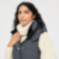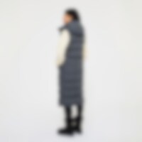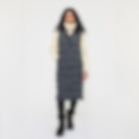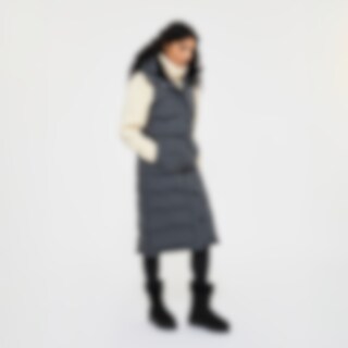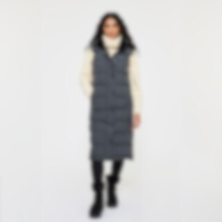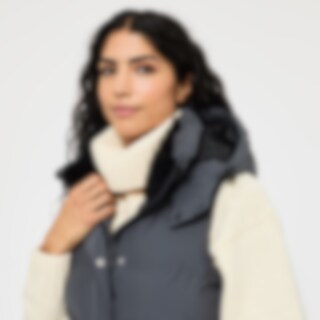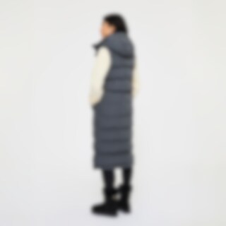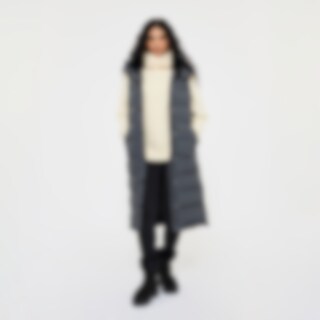 Modern lang vest met warme vulling. Het vest heeft een hoge kraag met zachte en verwarmende voering van imitatiebont en een verstelbare capuchon. Een doorlopende tweewegritssluiting met windflap en drukknopen. Tevens twee zakken voorop en twee rijopeninge