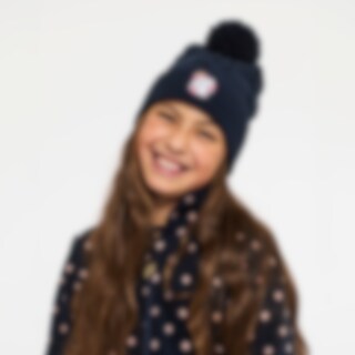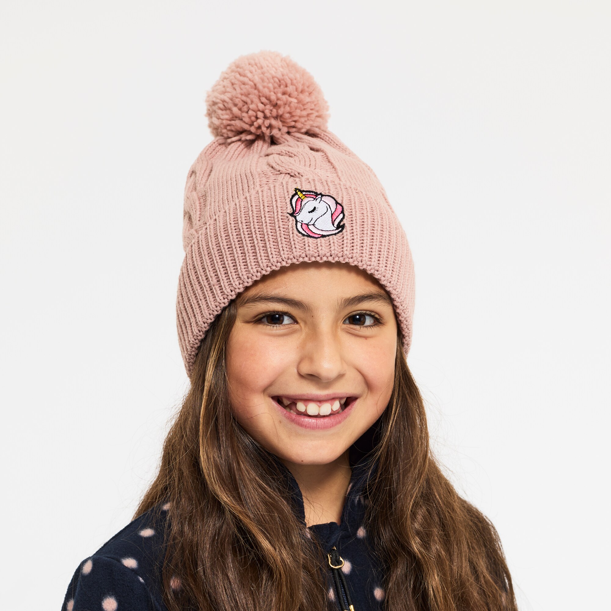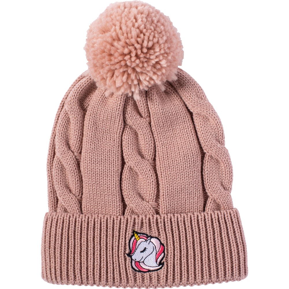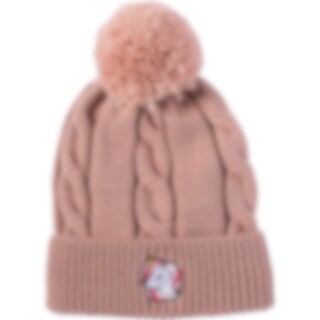 Gebreide kabelmuts met pompon. Oprolbaar gedeelte met decoratief borduursel middenvoor.