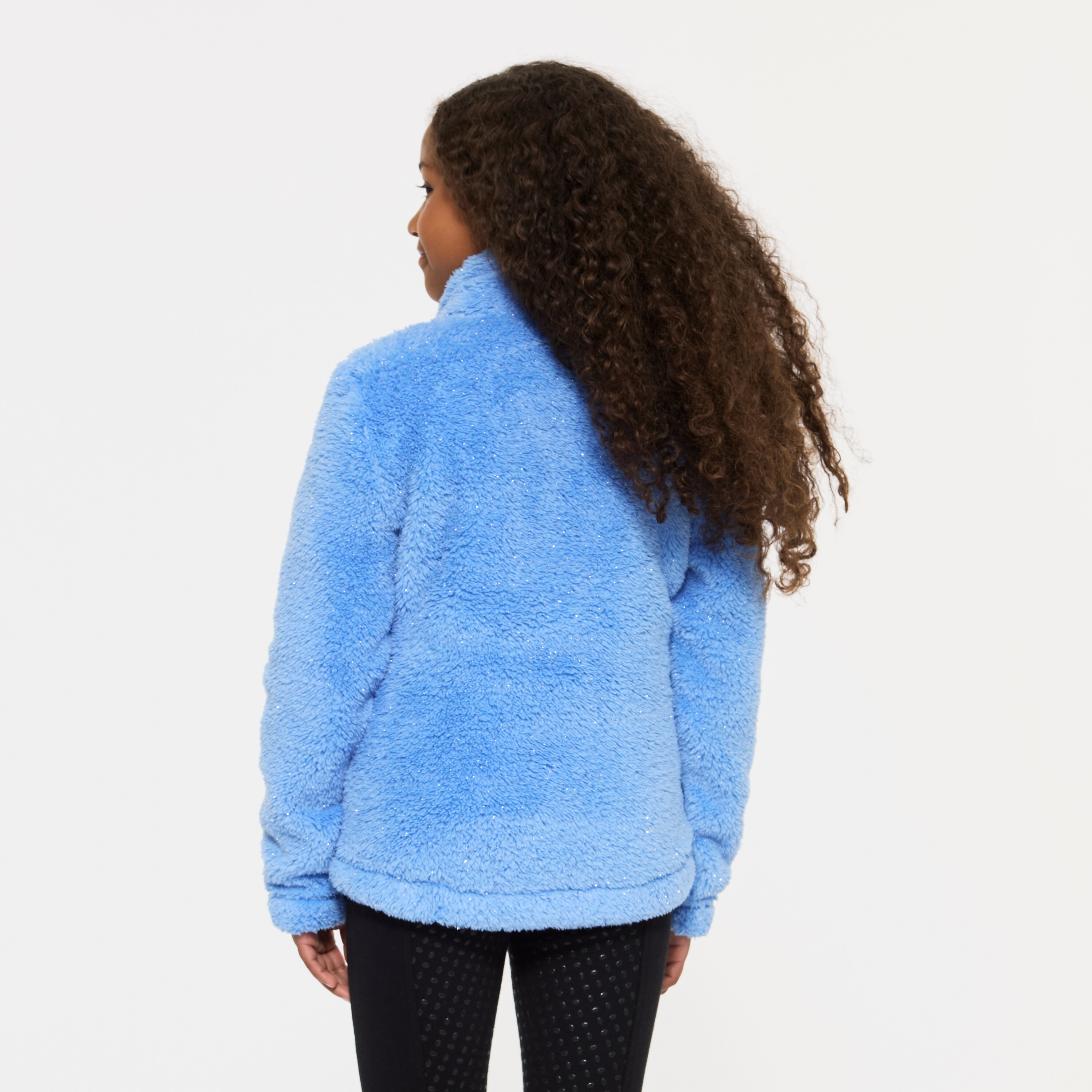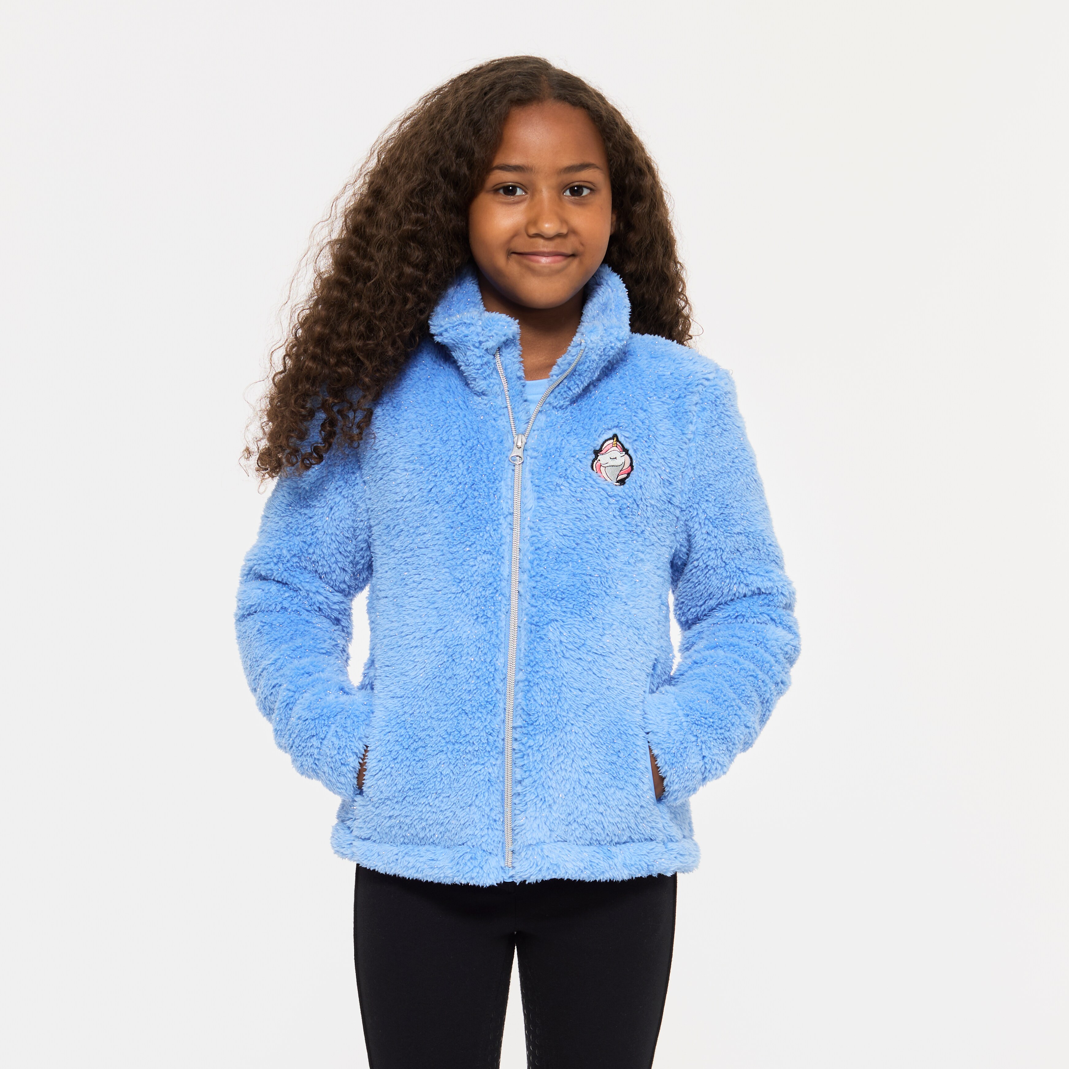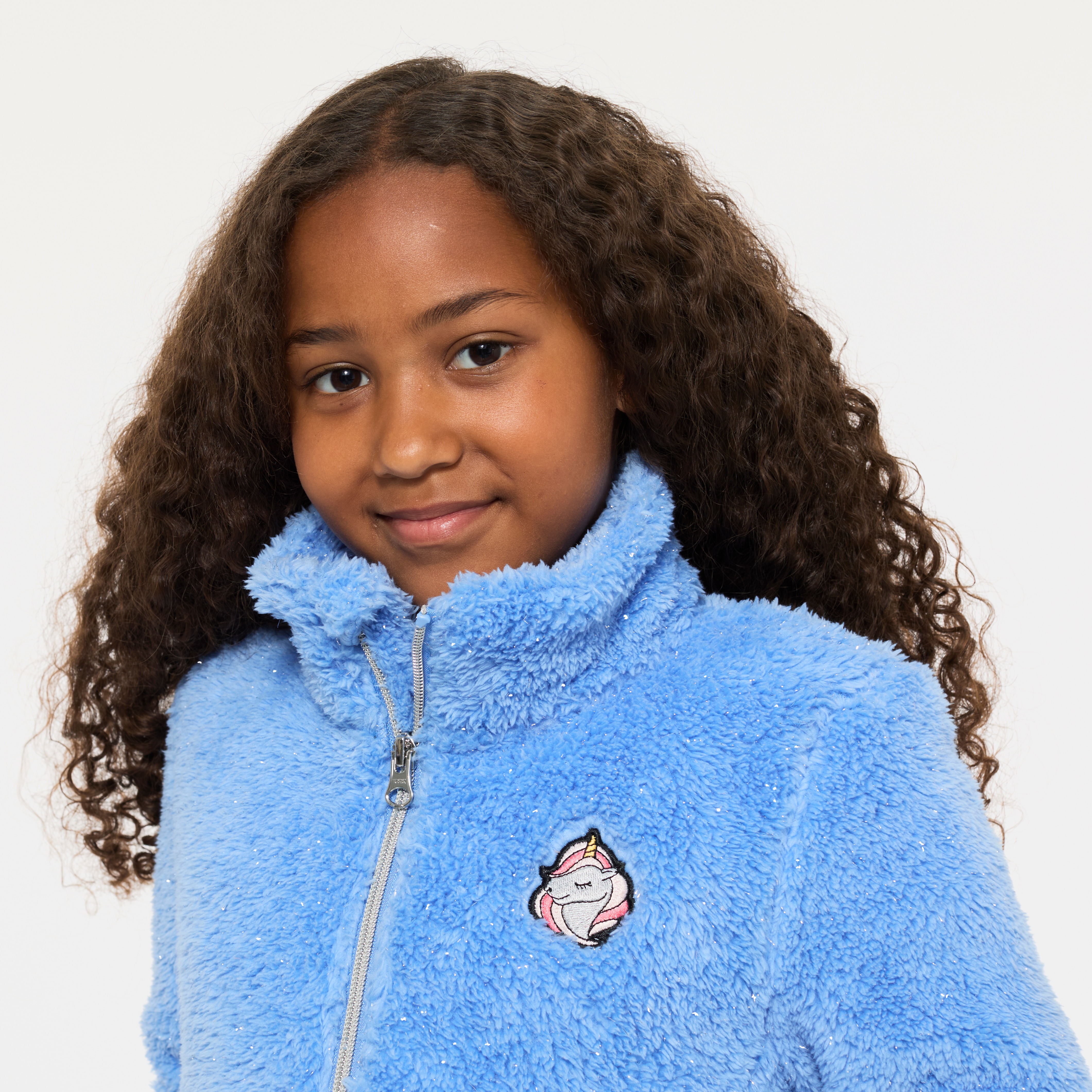 Een trui van zachte fleece met een hoge kraag, een ritssluiting aan de voorkant en twee open zakken. Kinbescherming zorgt ervoor dat het vest comfortabel zit en niet schuurt. De trui heeft glitterdraden en een geborduurde eenhoorn op de voorkant.