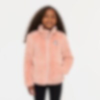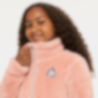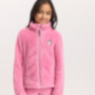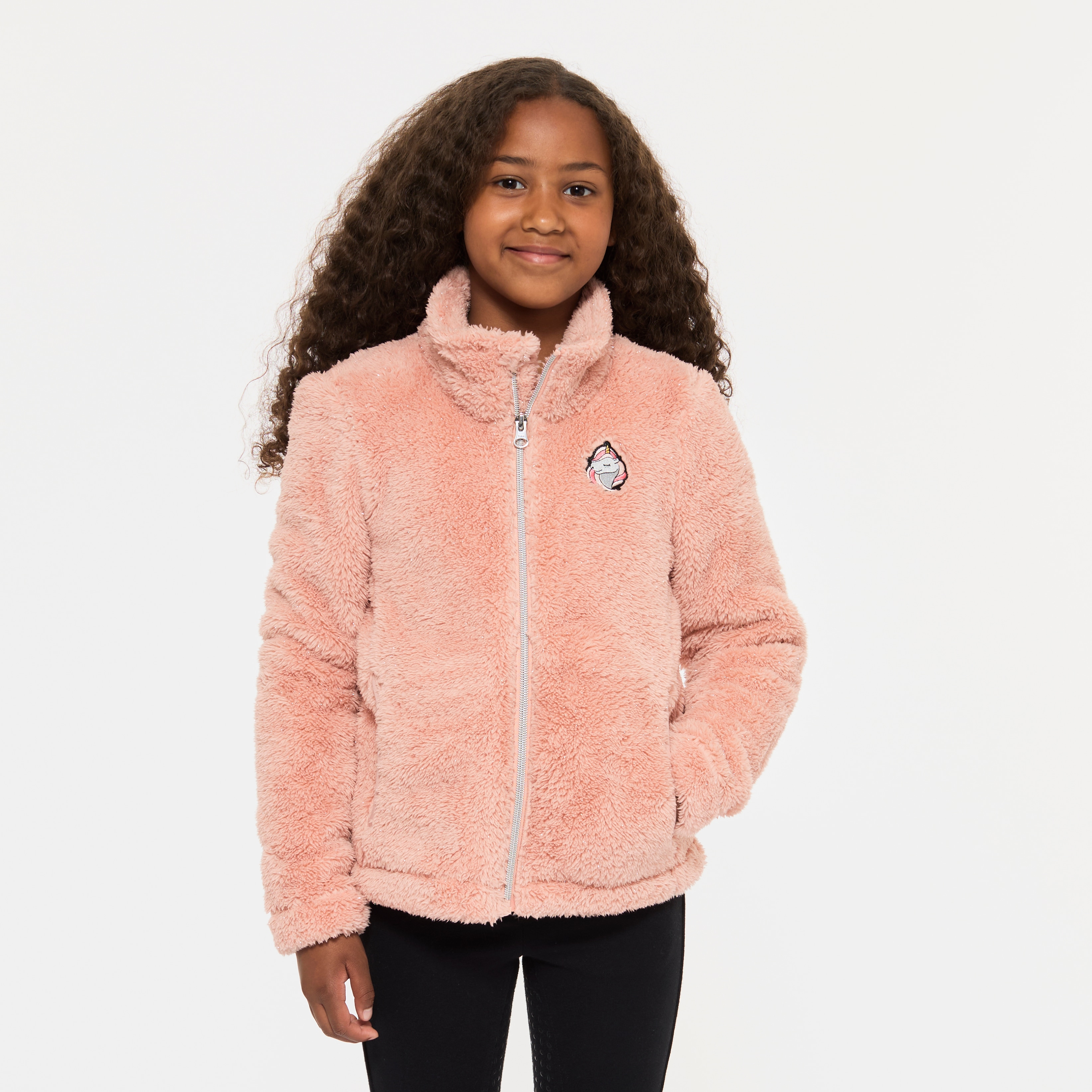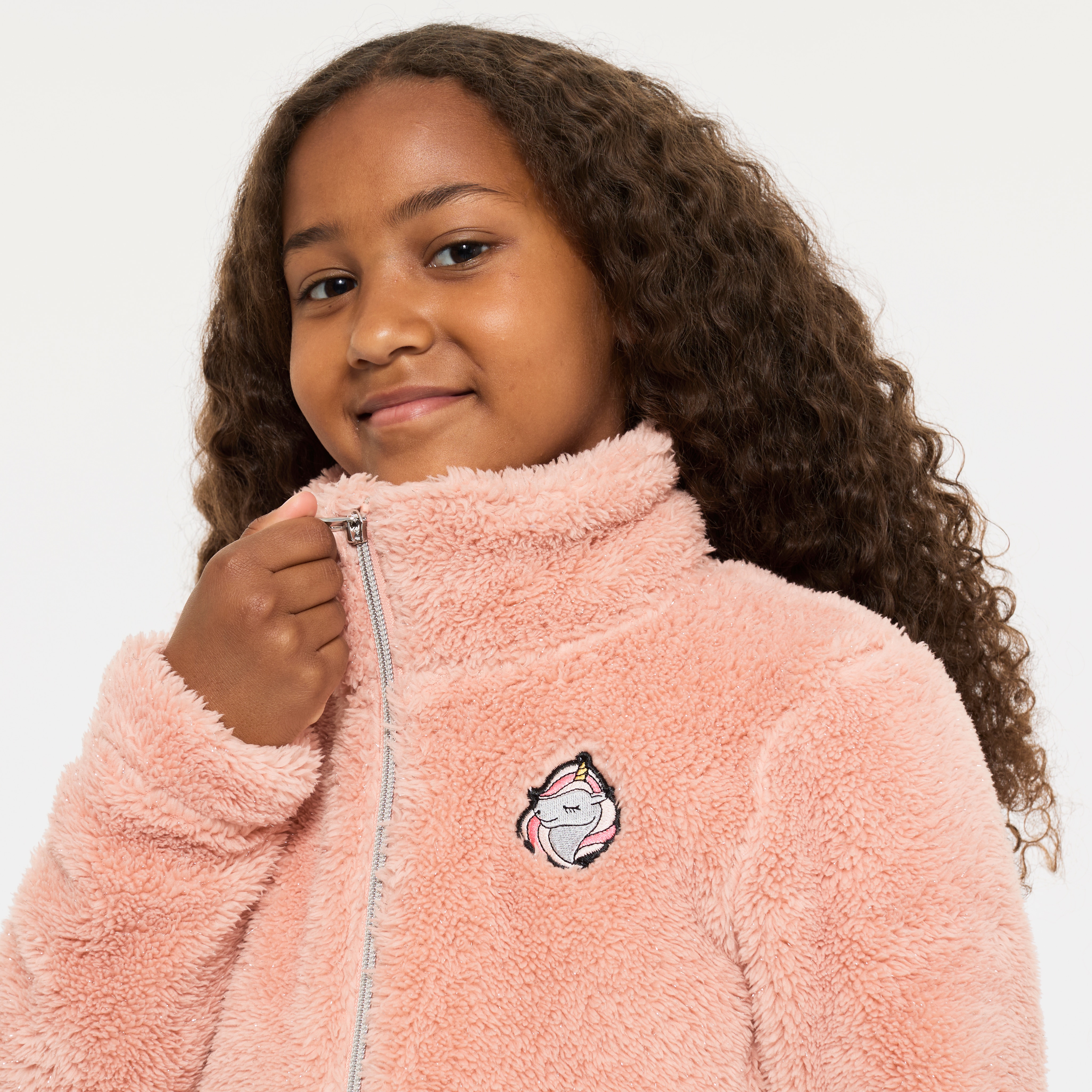 Een trui van zachte fleece met een hoge kraag, een ritssluiting aan de voorkant en twee open zakken. Kinbescherming zorgt ervoor dat het vest comfortabel zit en niet schuurt. De trui heeft glitterdraden en een geborduurde eenhoorn op de voorkant.