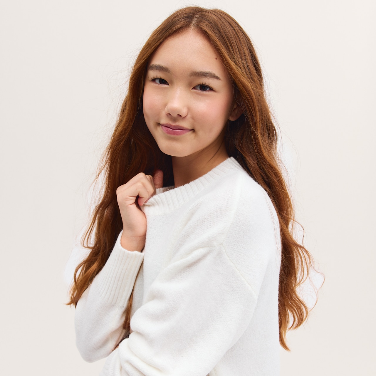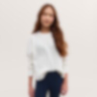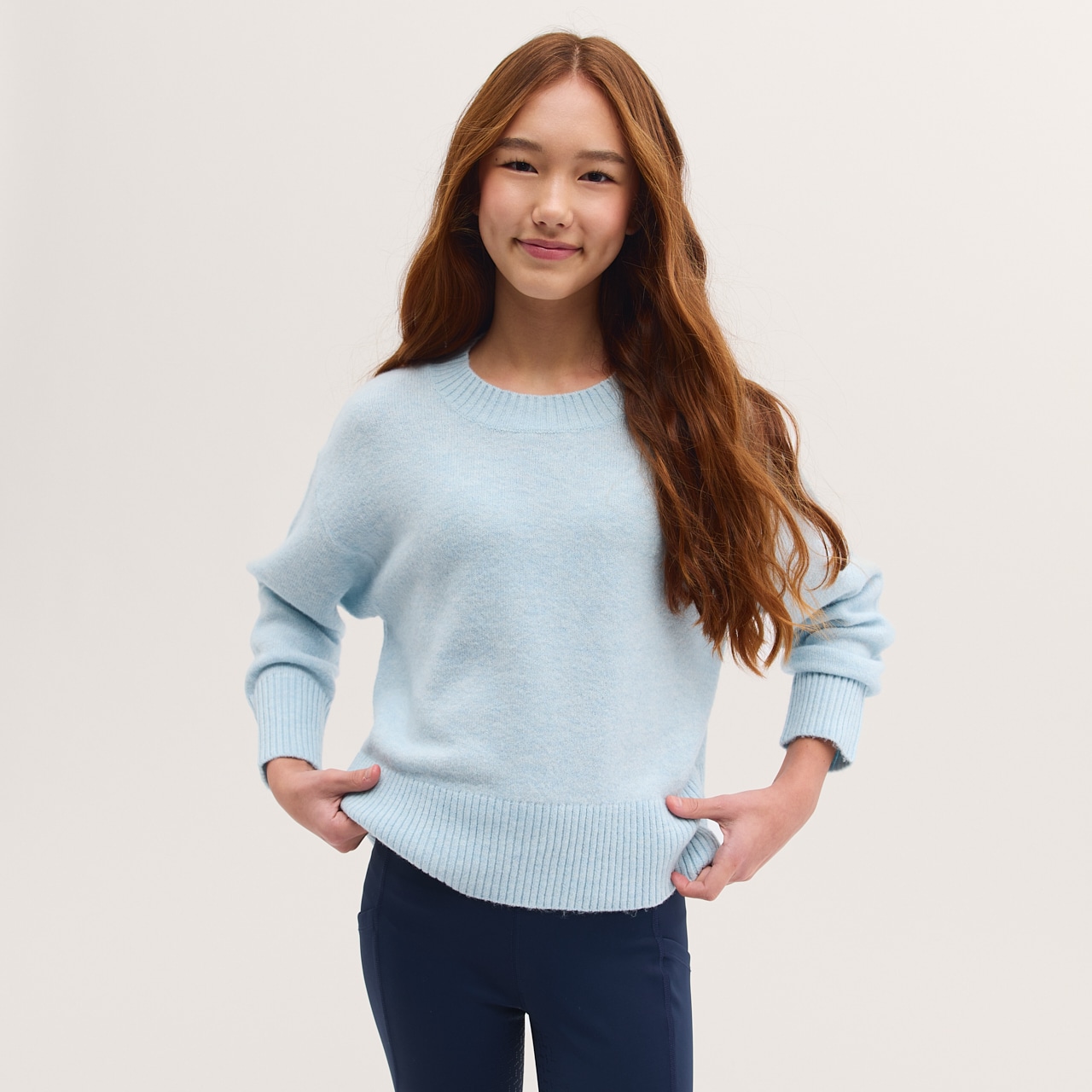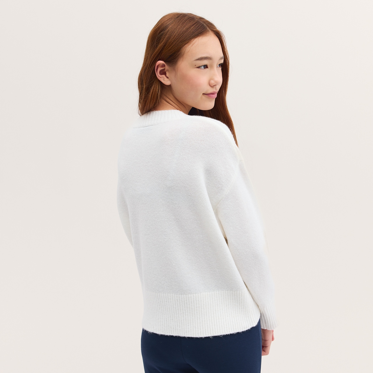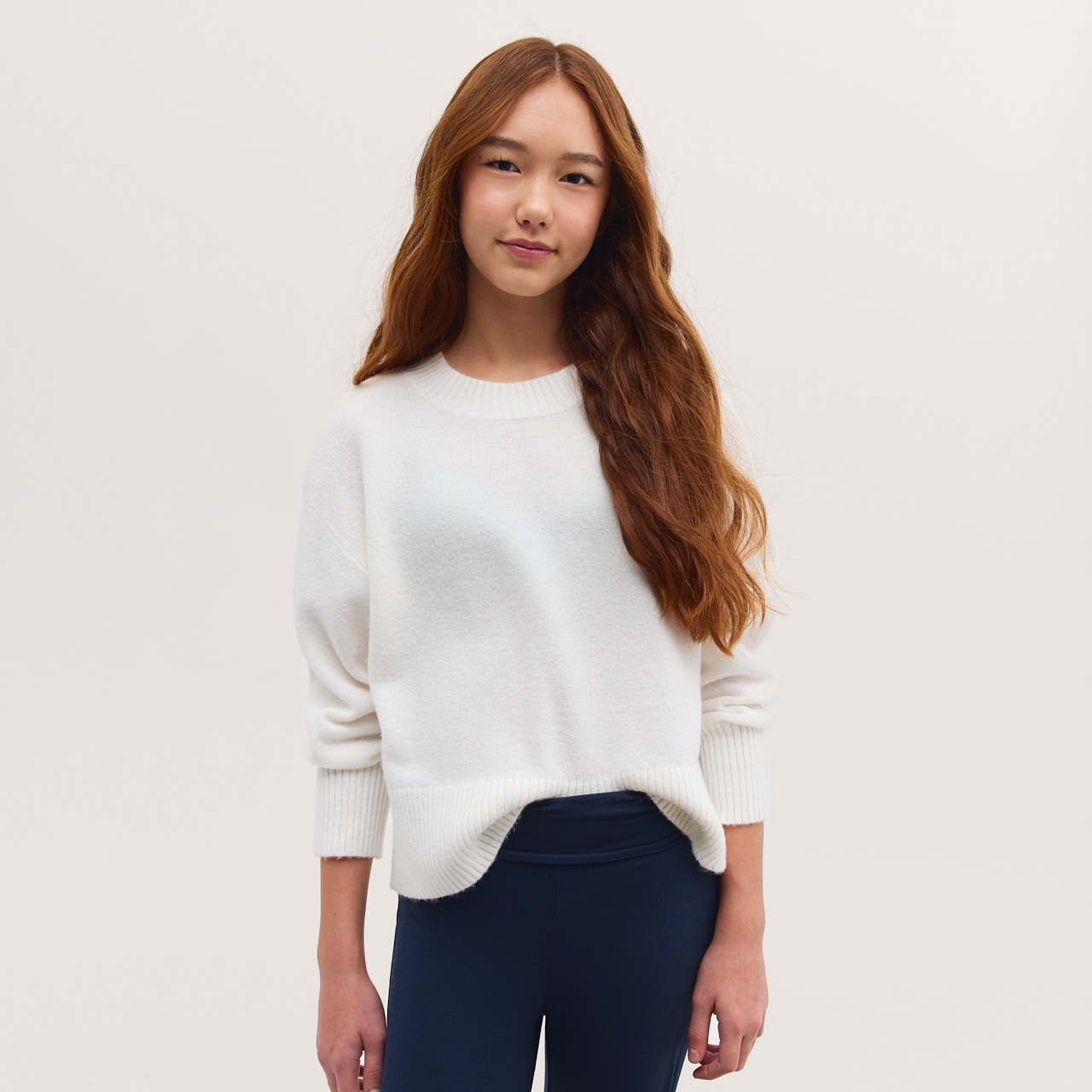 Gebreide trui van zachte en comfortabele kwaliteit. Ruimvallende pasvorm met ronde hals en geribde zoom en manchetten.