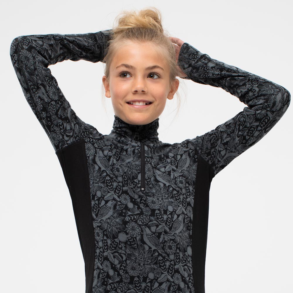 Onderstuk in twee delen vervaardigd van bamboevezel. Bamboevezels zijn rond en glad waardoor de huid koel wordt gehouden en tegelijkertijd het vocht wordt gereguleerd, dit voelt zacht en prettig aan. Halve polo met ritssluiting en duimgaten aan de mouwen. Rits in de taille.