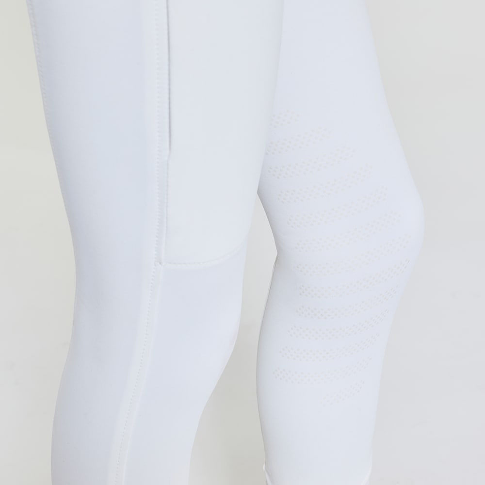 Geweven rijbroek met zadelinzet van rekbare, functionele stof. Vormvaste kwaliteit die slijtvast en vuilafstotend is, en uiterst comfortabel zit. Kniebescherming met grip waarbij de griplaag doorloopt op de binnenkant van de dij voor optimale grip en steun in het zadel zonder dat de broek volledig versterkt is. Elastiek onderaan de pijpen. Normale taillehoogte met dubbele sluiting zodat de rijbroek goed blijft zitten en extra comfort biedt. Twee zakken voorop en twee zakken met rits achterop. Onopvallend zakje met rits voor mobieltje aan de buitenkant van het dijbeen. Fraaie details met siersteentjes bij de zakken geven een elegant uiterlijk.