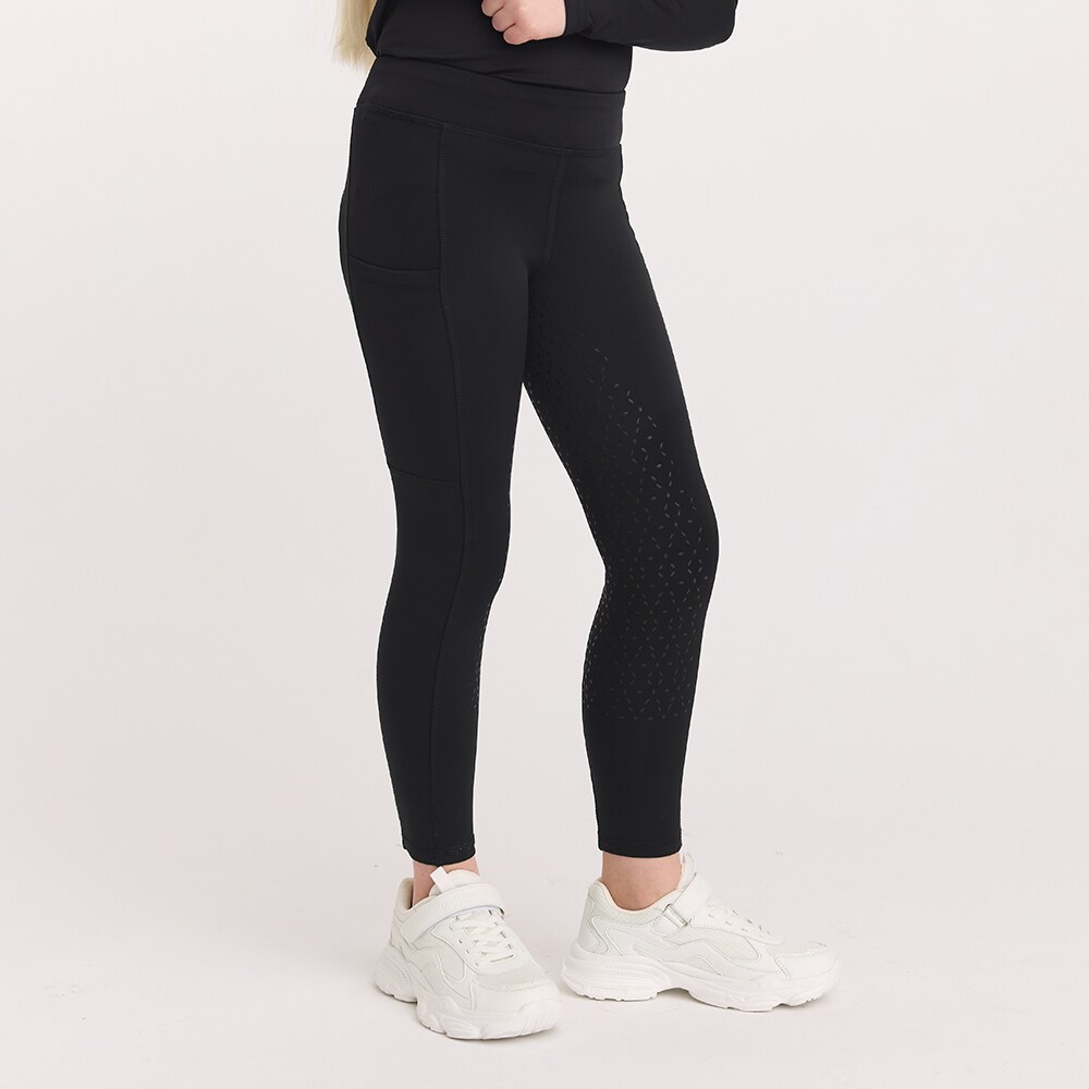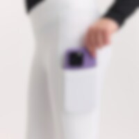 Rijlegging met zadelinzet van vormvast compressiemateriaal. Normale taillehoogte met een brede band die zowel goed comfort als stabiliteit biedt. Met volledige griplaag voor een zachte zit in het zadel. Open zakken voor mobiele telefoon op de bovenbenen,