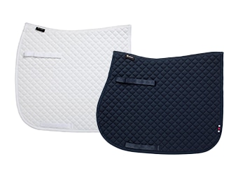Op dekens en sjabrakken staat de naam van de ruiter gewoonlijk aan de linkerzijde en de naam van het paard aan de rechterzijde.