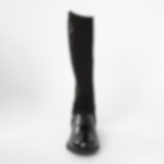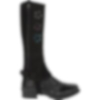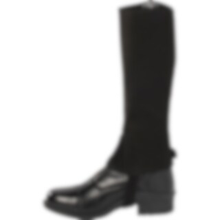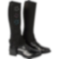 Korte chaps van zacht synthetisch suède met elastiek langs de ritssluiting. Versierd met geborduurde hoefijzers en stenen.
