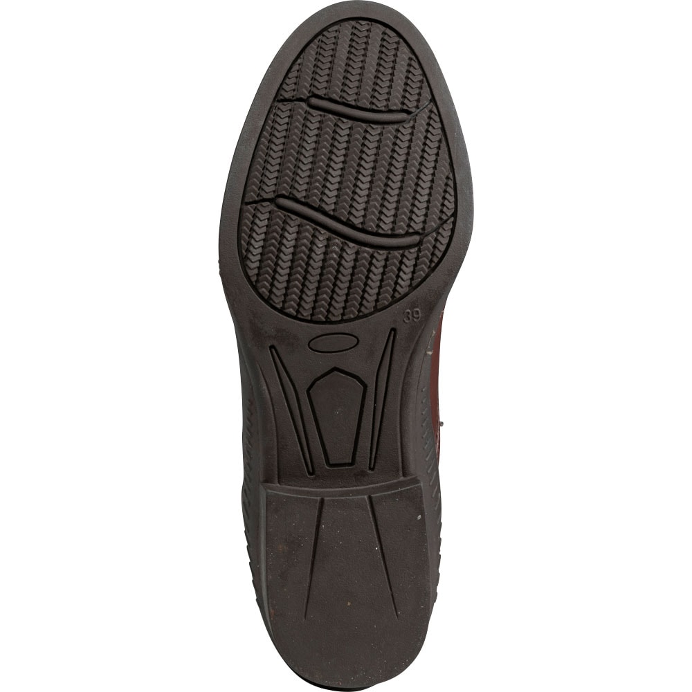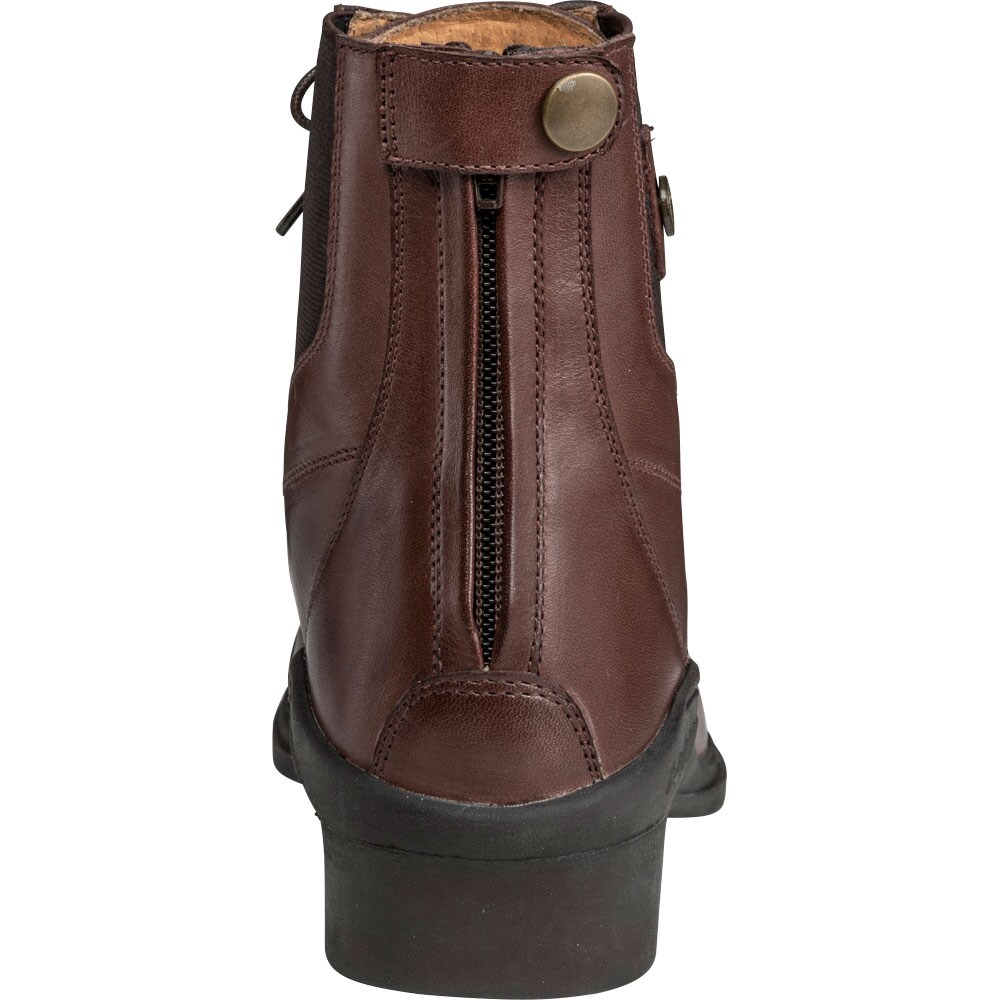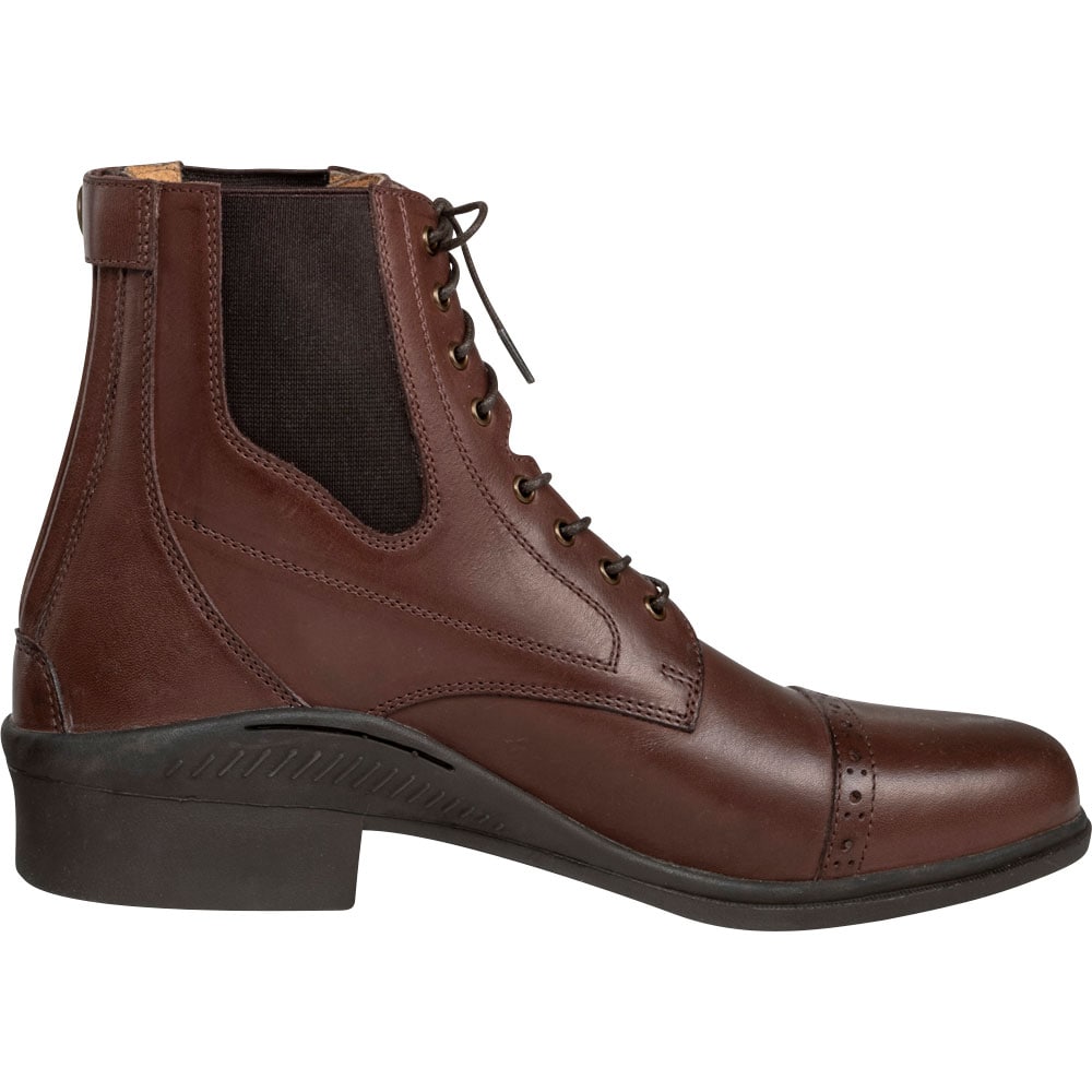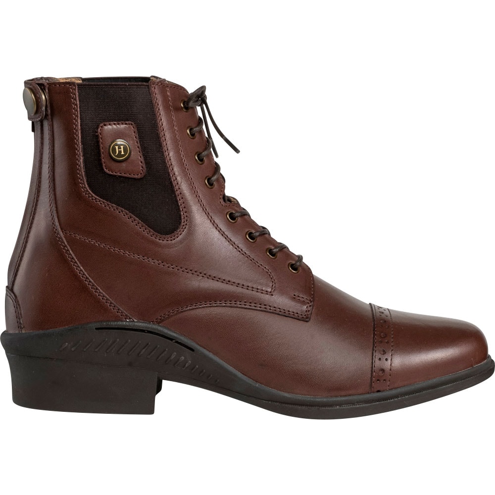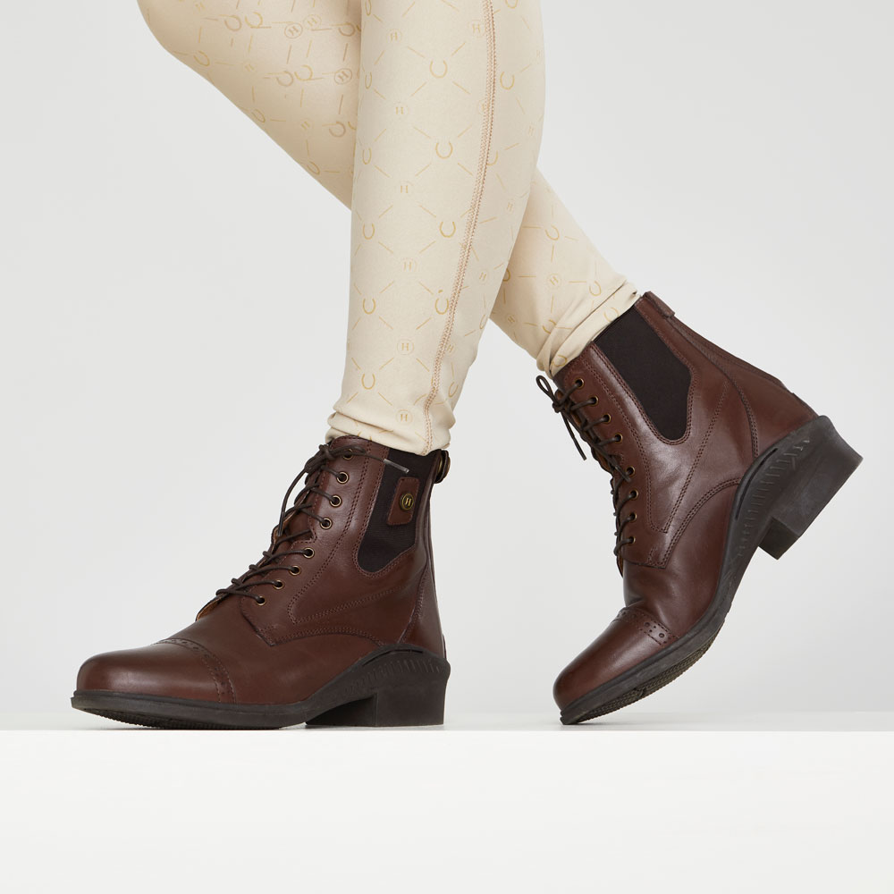 Klassieke jodhpur met vetersluiting en broguepatroon. Ritssluiting aan achterzijde en elastische stof aan de zijkanten. Binnenzijde bekleed met leer en binnenzool van synthetische stof. Buitenzool van rubber.