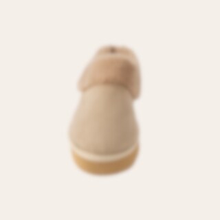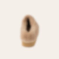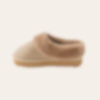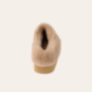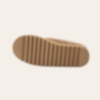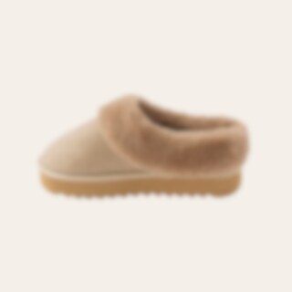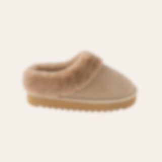 Pantoffel met dikke zool met een ruw patroon en gevoerd met zacht synthetisch bont. Kan buiten worden gebruikt.