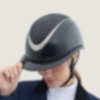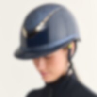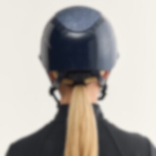 Rijhelm in een hoogglans metallic afwerking, versierde middenplaat en decoratief detail boven de rand. Laag gewicht en ventilatie voor en achter zorgen voor een helm die comfortabel is tijdens de rijsessie. Verstelbaar met schroef aan de achterkant voor g