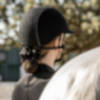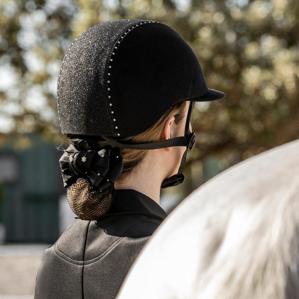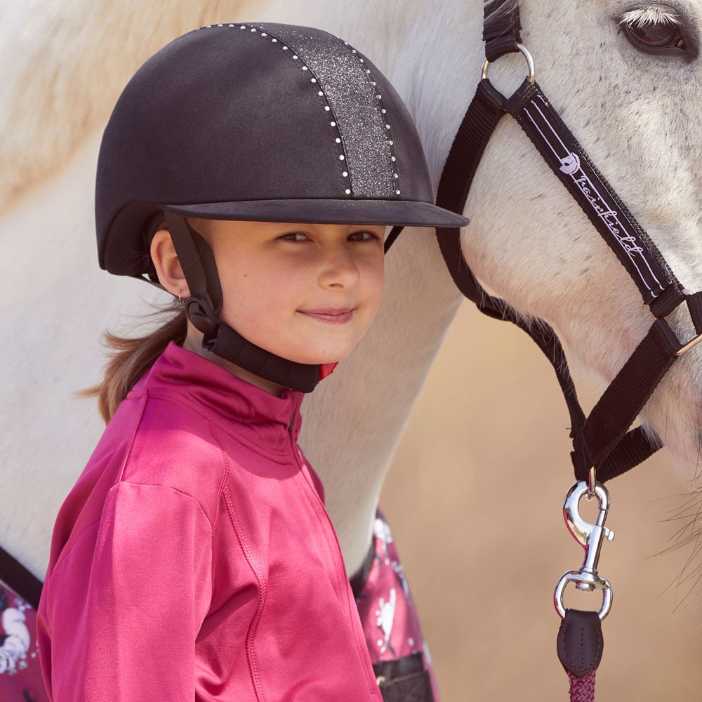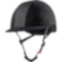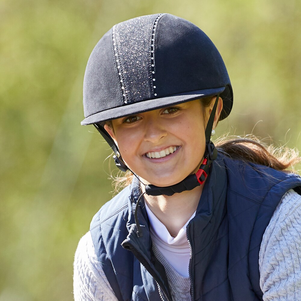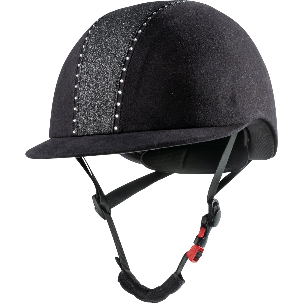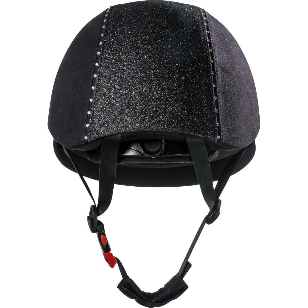 Rijhelm van microvezel versierd met kristallen en glitter. In maat verstelbaar. Nylon kinband. Uitneembare en wasbare voering. XS: 49-51cm. S: 52-54 cm. M: 55-57 cm. L: 58-60 cm.