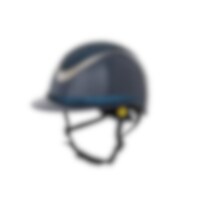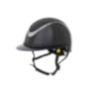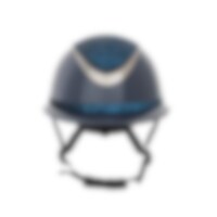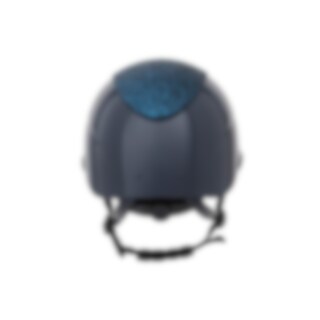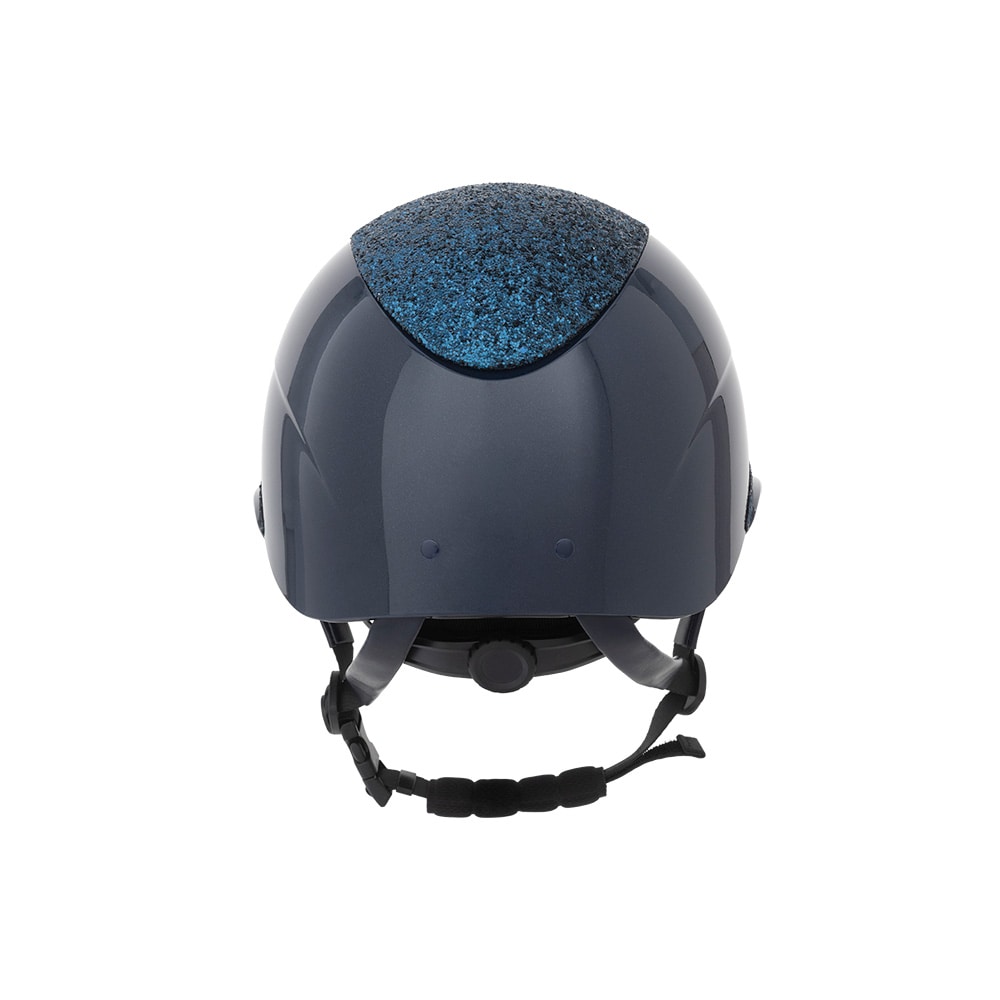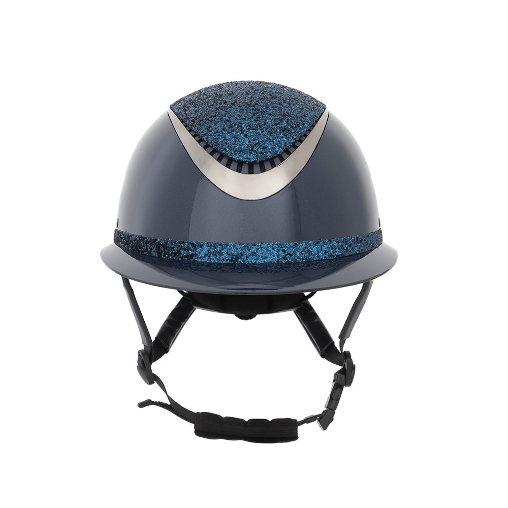 Rijhelm in een hoogglans metallic afwerking, versierde middenplaat en decoratief detail boven de rand. Laag gewicht en ventilatie voor en achter zorgen voor een helm die comfortabel is tijdens de rijsessie. Verstelbaar met schroef aan de achterkant voor g