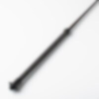 Korte springzweep met rubberen ribbelhandvat voor goede grip, kunststof knop en 7 cm breed zweepkoord van synthetisch leer.