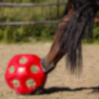 Hooibal van duurzaam kunststof, voor gebruik in paddocks en paardenboxen. Houdt paard lang bezig, houdt ongeveer 3 kg hooi vast. 19 holes van ca. 6 cm. 40 cm doorsnede. Denk eraan om de hooibal niet te gebruiken voor kleinere paarden / veulens, omdat ze vast kunnen komen te zitten aan de hoef. Er zijn ook enkele gevallen bekend waarbij paarden met hun kaak vast kwamen te zitten in hooiballen van verschillende merken. Houd uw paard indien mogelijk onder toezicht.