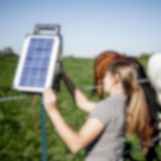 Een 12 v-zonnecelaggregaat voor kortere omheining (ca 800 m met twee draden, samengekoppelde draden met gelijke tussenruimte). Voorzien van 8 W-zonnepaneel, 12 Ah-accu, functie-indicator, accu-indicator (waarschuwt bij lage accuspanning) evenals bescherming tegen ontlading. Wordt geleverd met adapter voor opladen van de accu, kabel voor omheining en aardeaansluiting en een kleine aardpen. Moet worden bijgeladen nadat deze is opgeslagen voor de winter. 1,4 J opgeslagen energie, 1,0 J energie-afgifte.