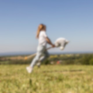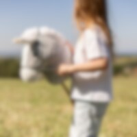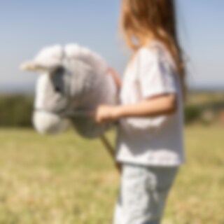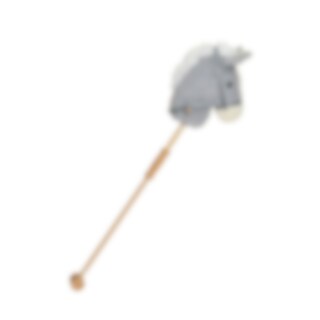 Grijs/wit stokpaardje met houten handvatten aan de zijkanten en houten wielen aan de onderkant van de stok, waardoor kinderen makkelijk kunnen sturen en stabiel blijven tijdens het spel. Kinderen kunnen het stokpaardje gemakkelijk besturen en hun fantasie