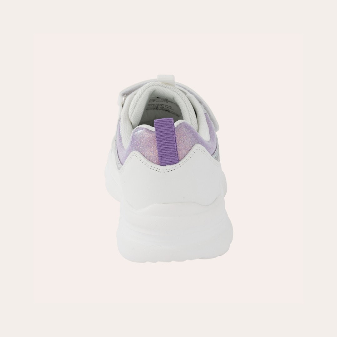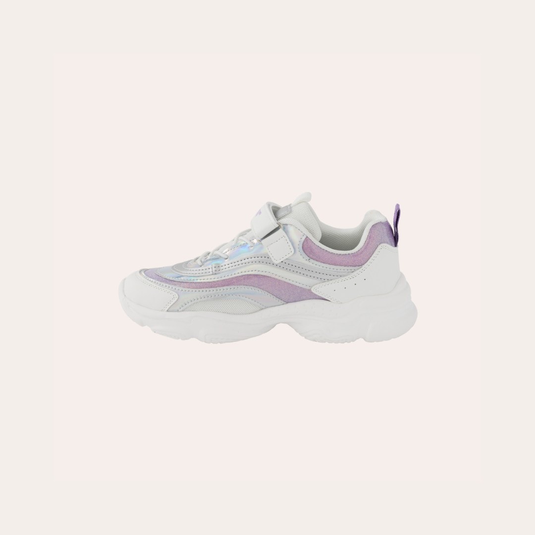 Sneakers van synthetisch materiaal met een natuurkleurige buitenzool. Decoratie aan de zijkant in een contrasterende kleur.